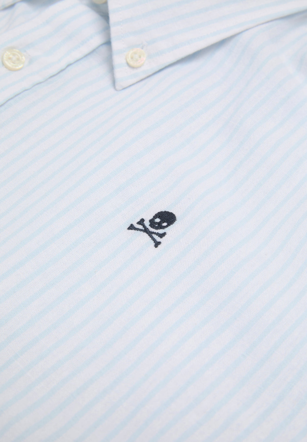 Oxford shirt made of a cotton and linen blend. Stripe print. Front button fastening. Contrast embroidered skull on the chest.