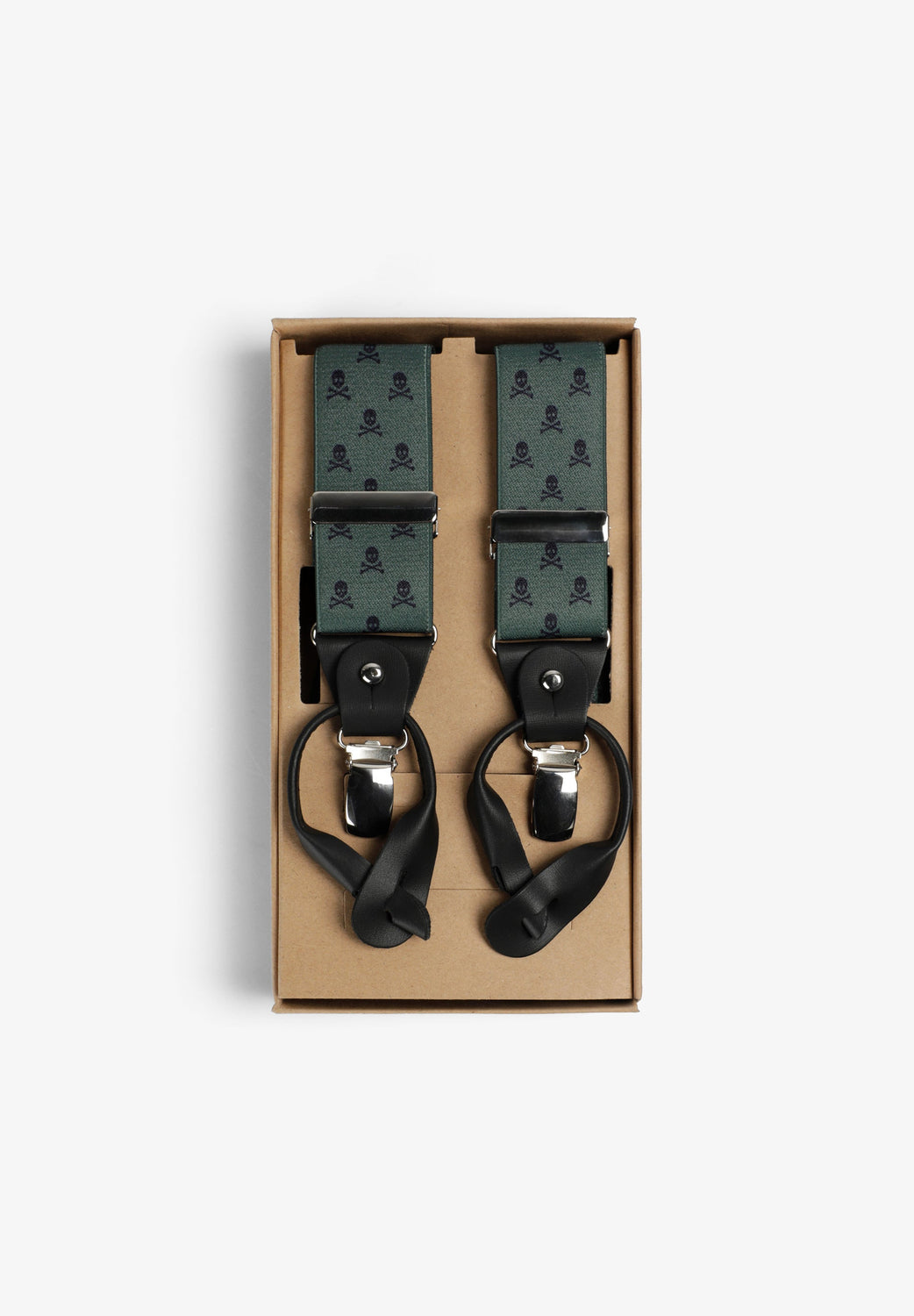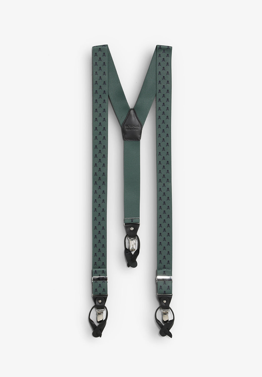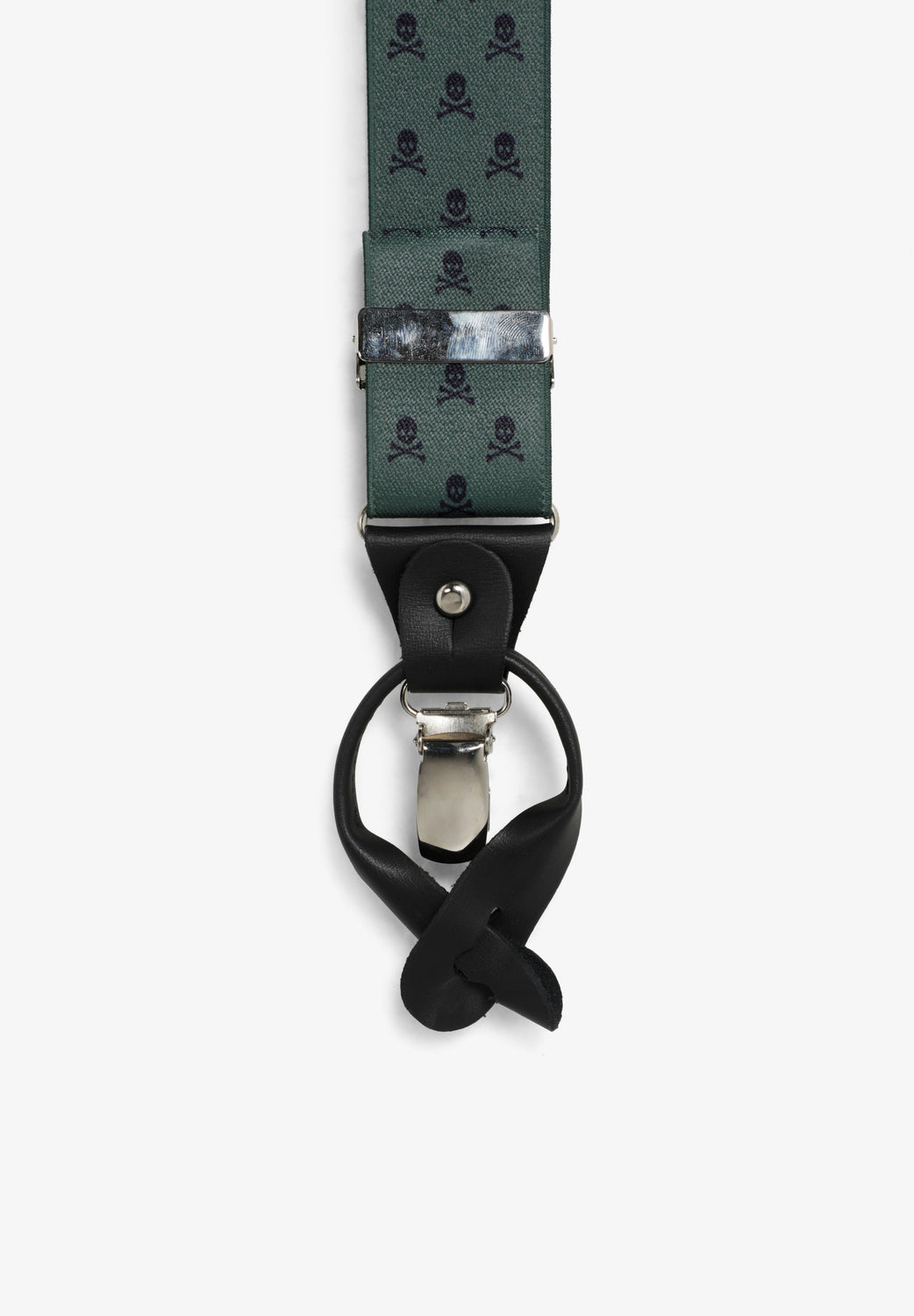 Elasticated braces with skull design. Metal details and leather runners.