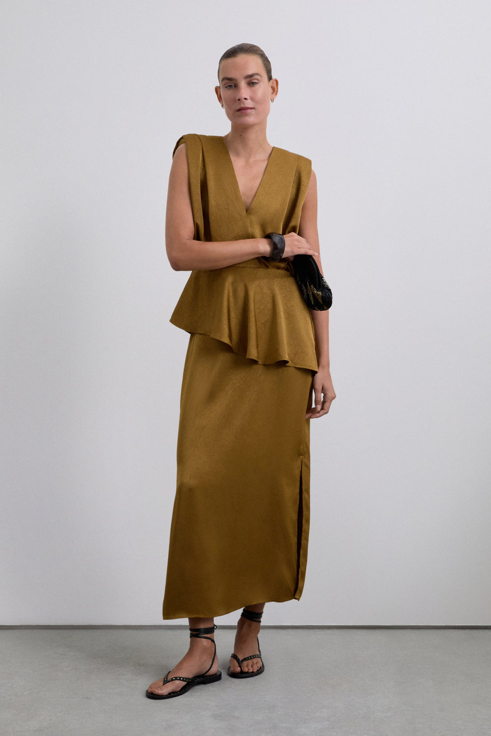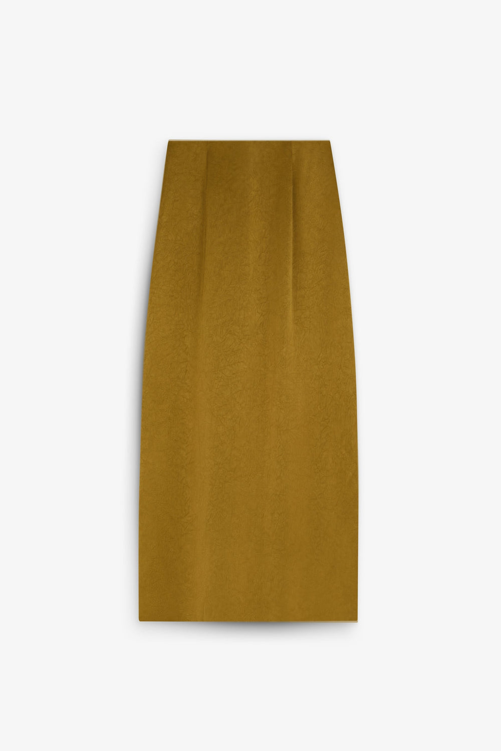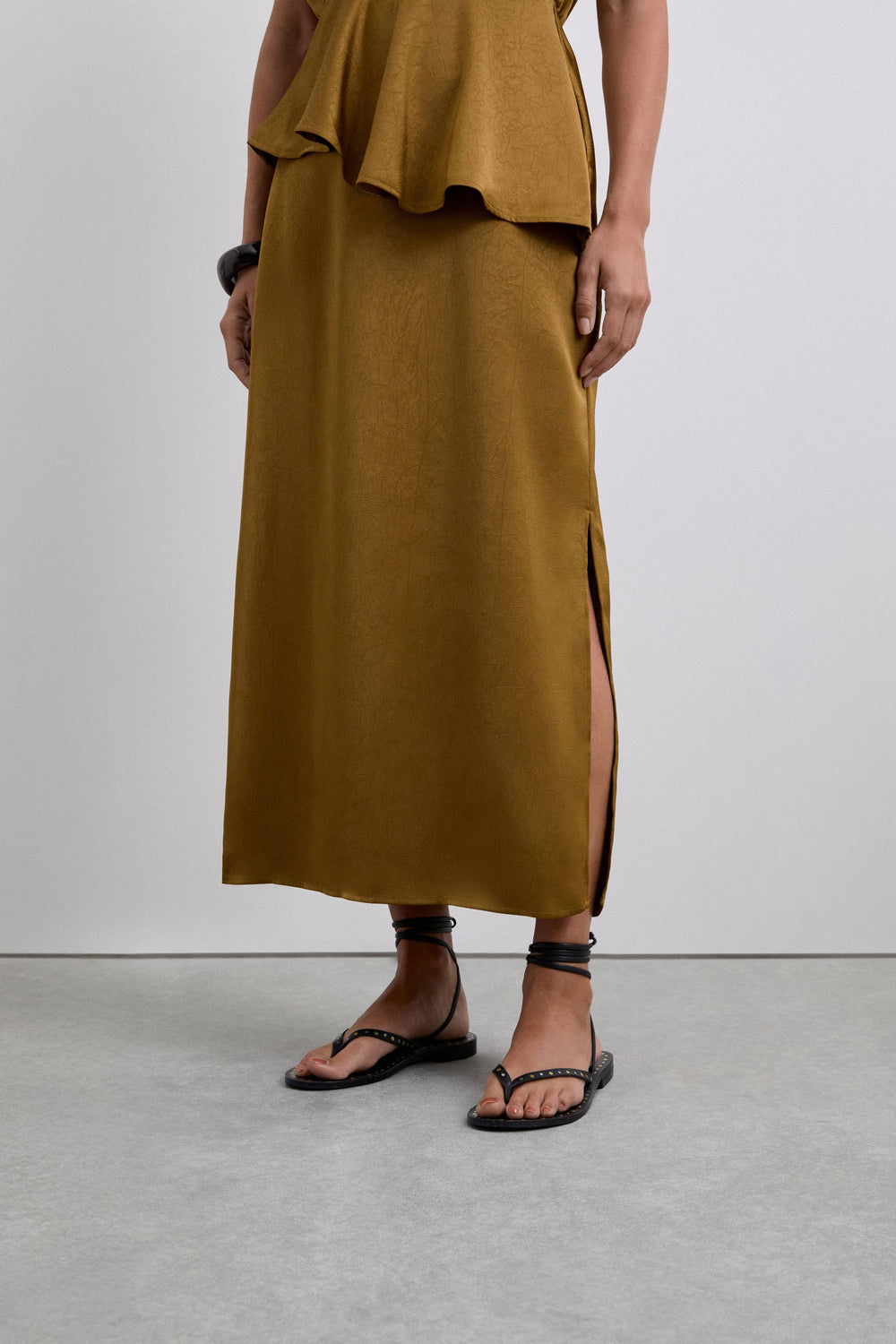 Falda midi confeccionada en tejido fluido con textura. Cierre con cremallera oculta lateral y abertura en pierna.