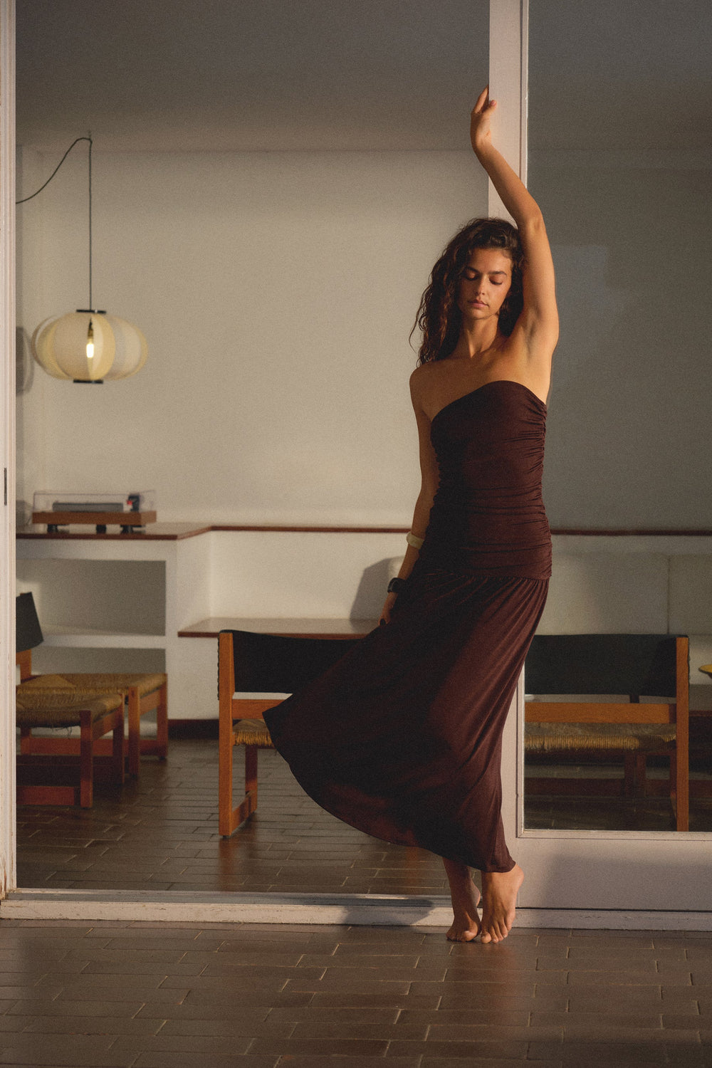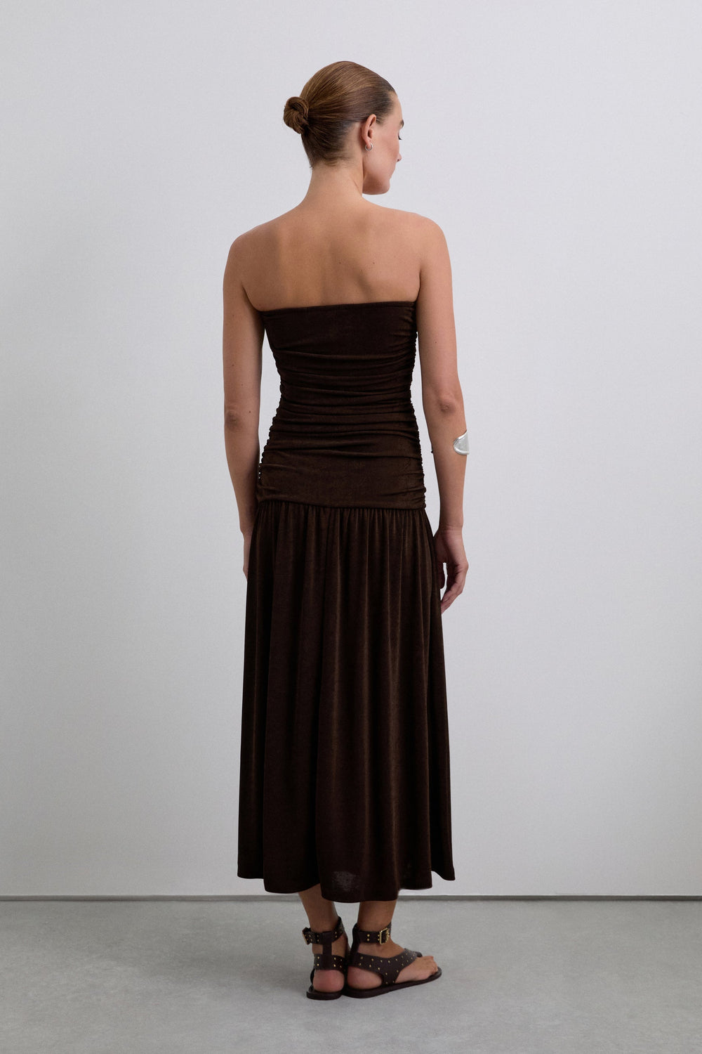 Dress made of slightly stretchy fine knit. Slim fit, strapless, gathered detail on body. Midi cut.