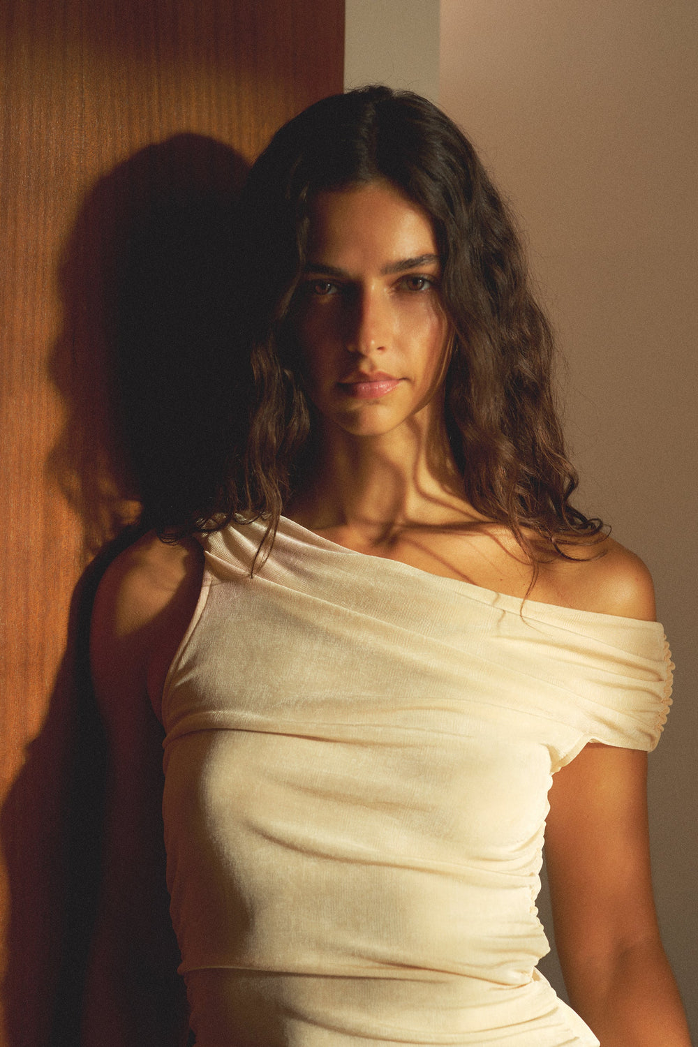 Top made of slightly stretchy fabric. Slim fit, Off The Shoulder, asymmetric neckline with gathers on the sides.