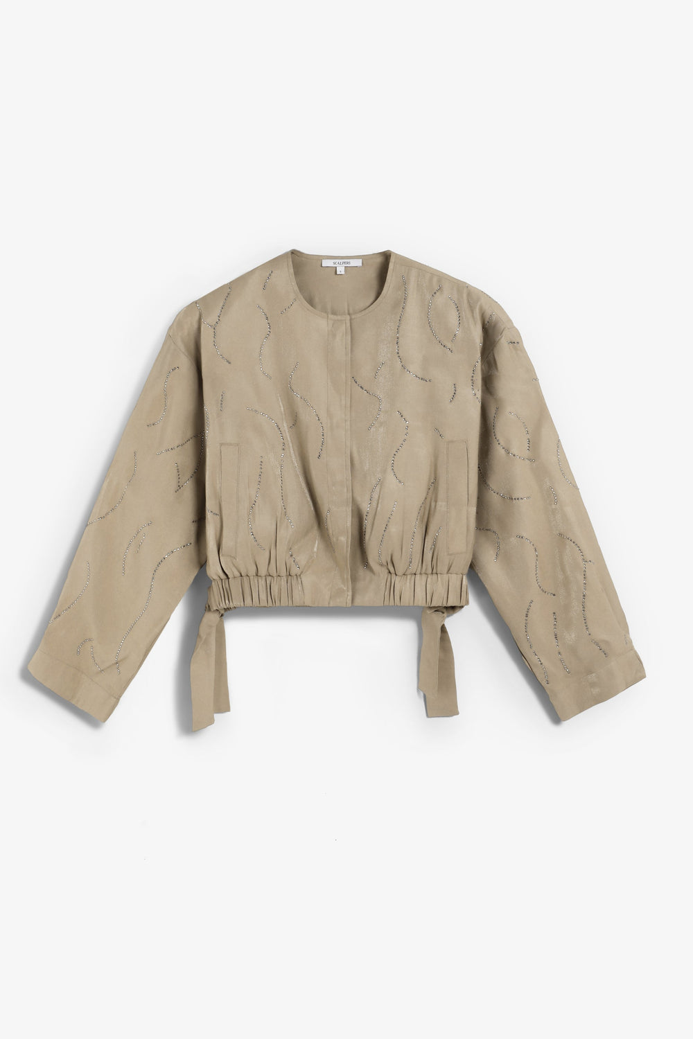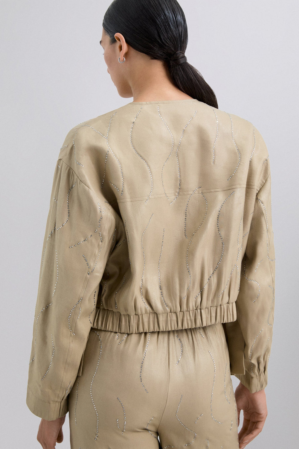 Bomber jacket with rhinestone detailing. Front zip and button fastening. Round neck. Gathered cuffs and hem. Flowing fabric with satin finish. Elasticated waistband with side tie details.