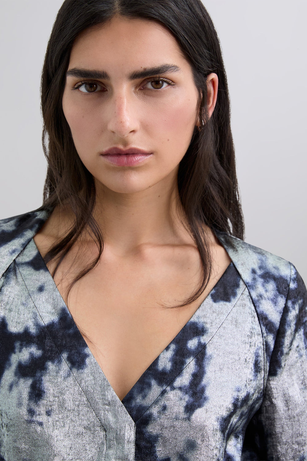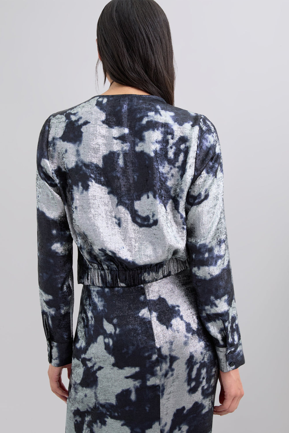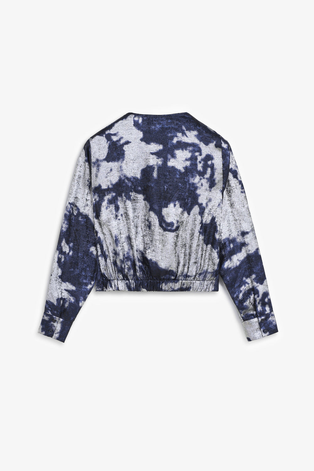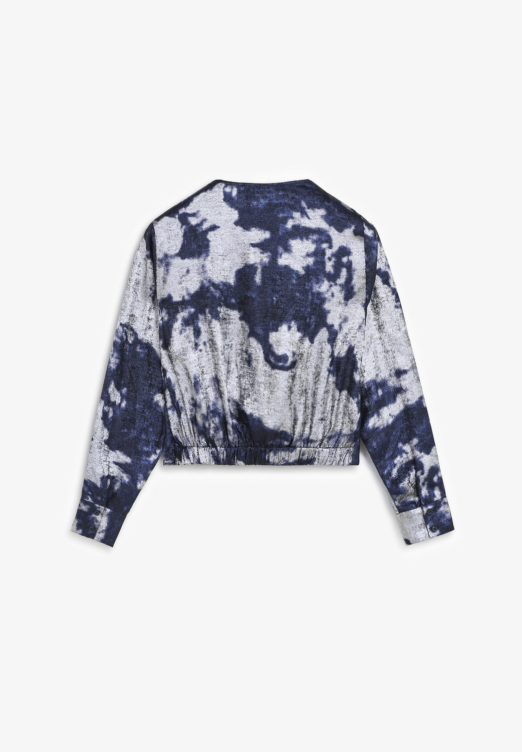 Flowing fabric blouse with tie-dye print and metallic details. Slim fit. V-neck. Long sleeves. Slightly cropped.