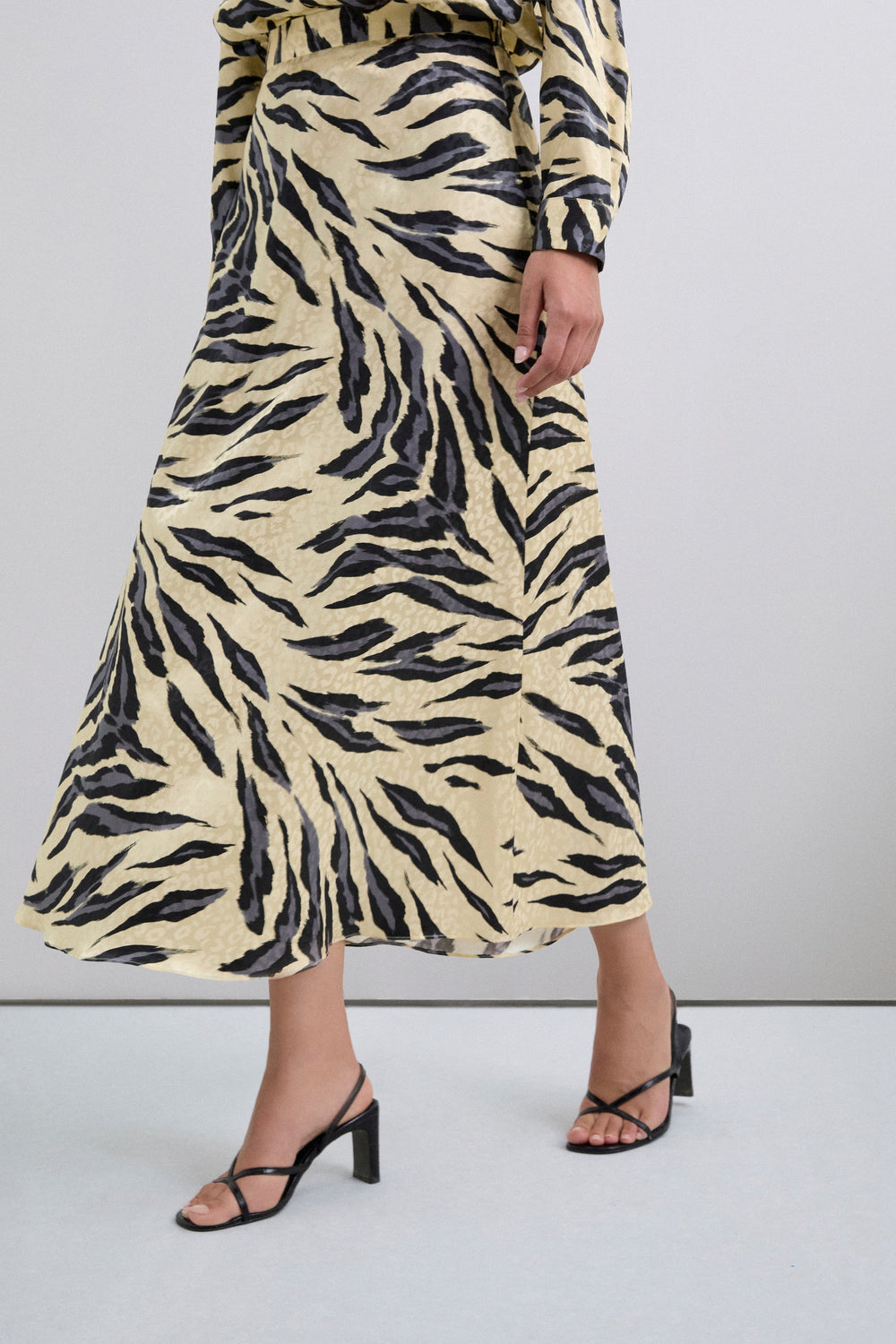 Falda midi. Estampado animal print. Cintura elástica. Ondas en el bajo.