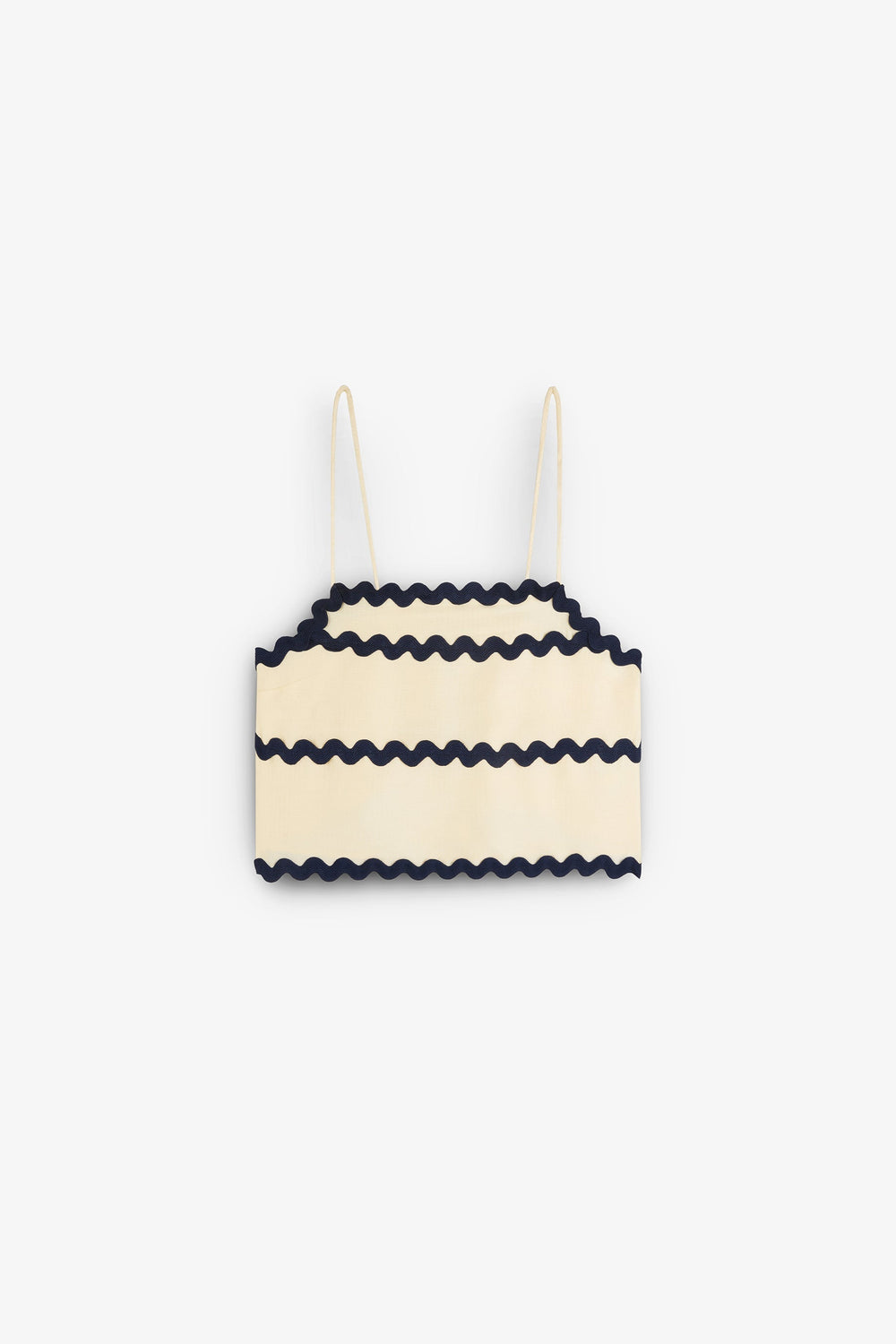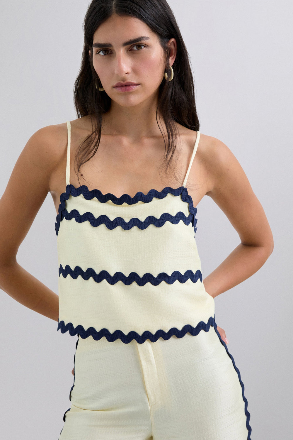 Top de tirantes finos y escote recto. Detalle de ondas a contraste. Corte cropped.