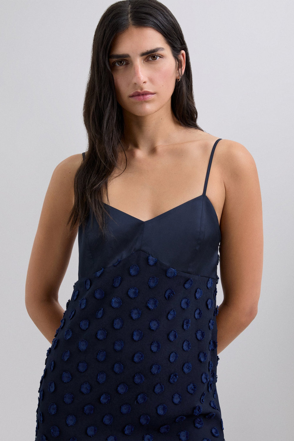 Midi dress in jacquard fabric with a polka dot print. Satin-finish bodice piece. With straps. Side zip fastening.