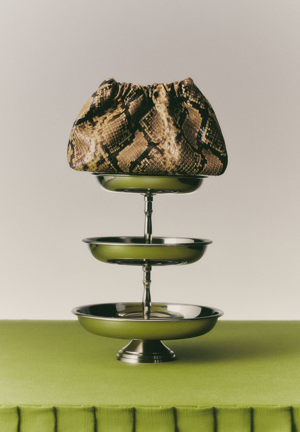 Handbag made in PU with animal print. Inner lining, removable double long handle. Magnetic button fastening.