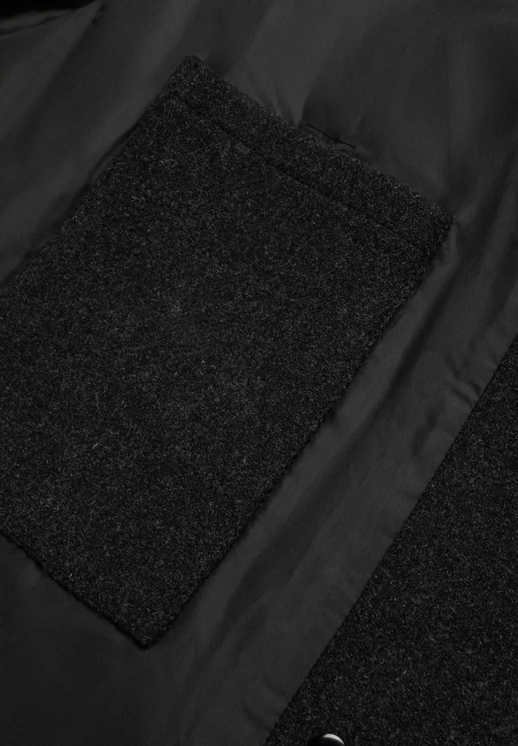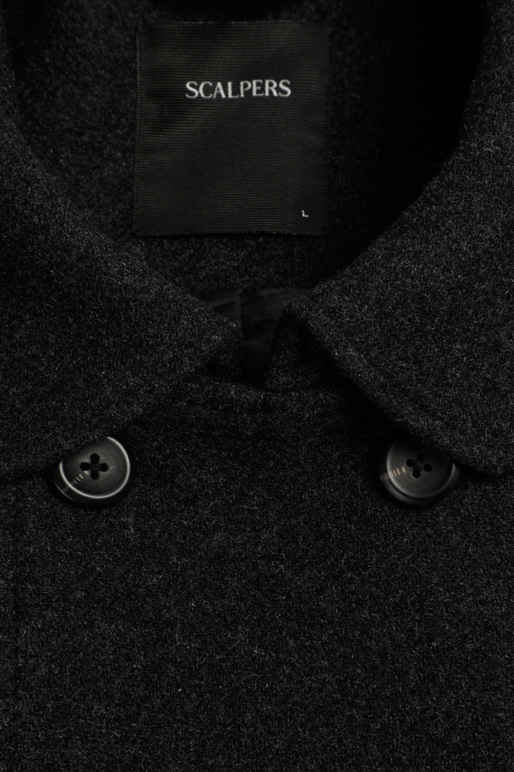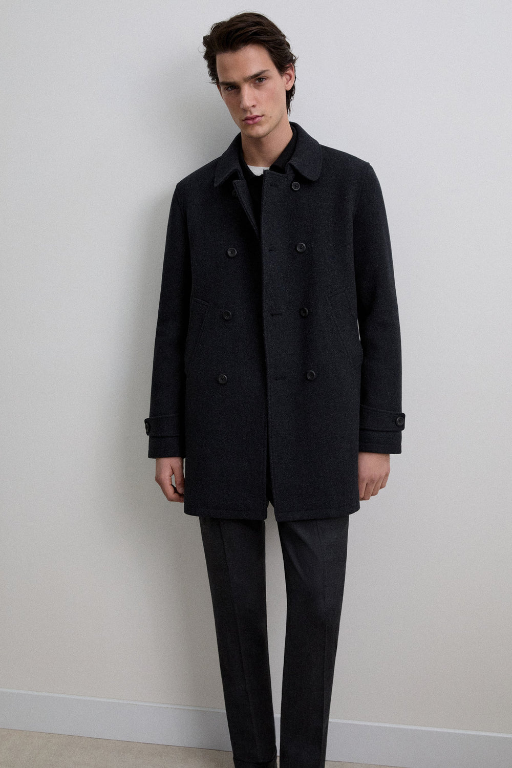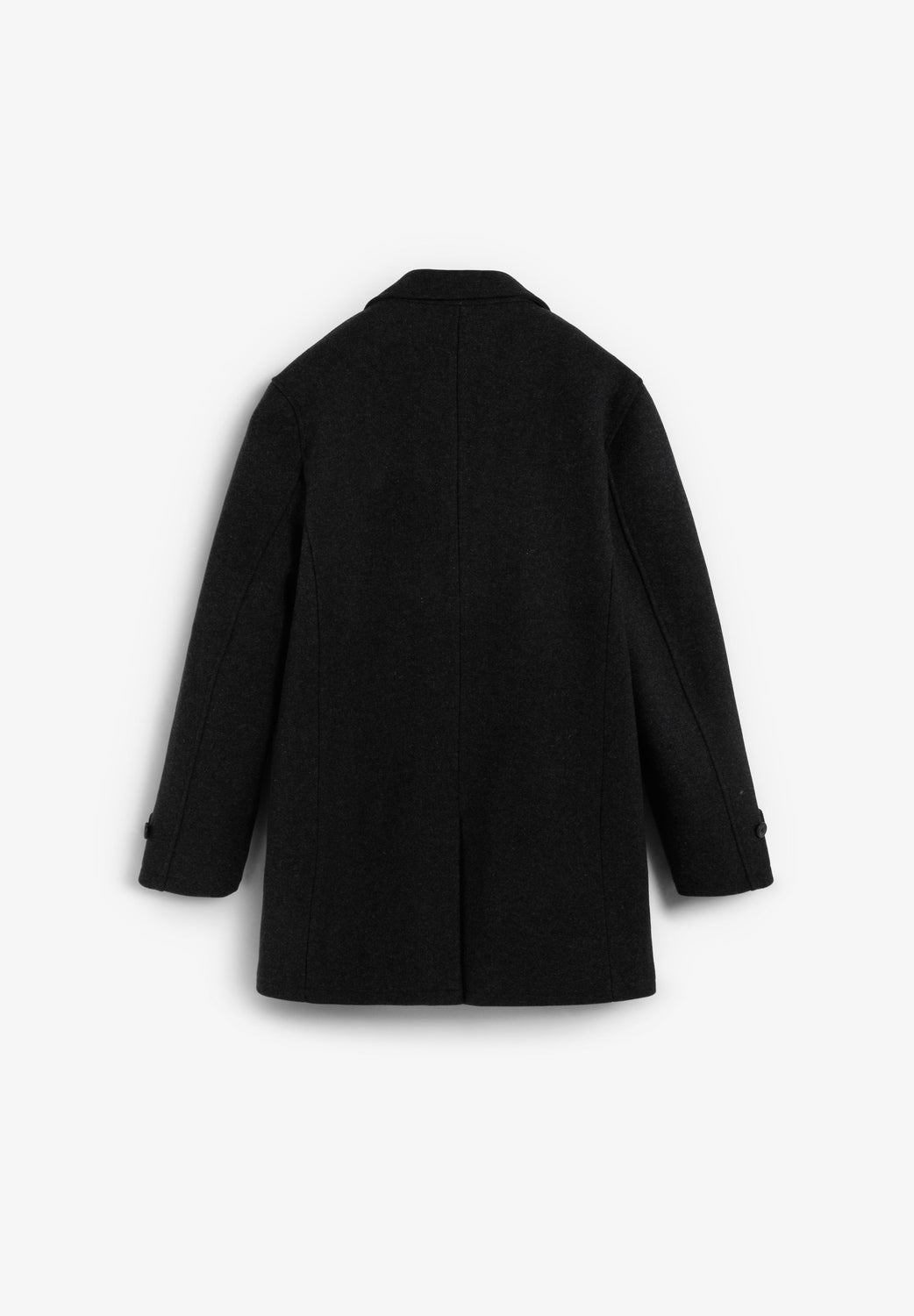 Double-breasted coat in a wool blend. Button-up front. Front slanted piped pockets. Inner pocket. Cuff detail with tabs.
