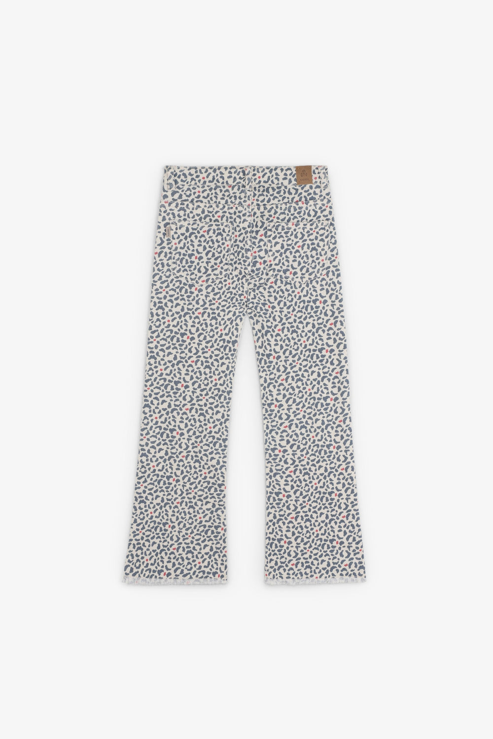 Pantalón vaquero. Dos bolsillos en frontal. Dos bolsillos posteriores con detalle de etiqueta con logo y calavera. Motivo desflecado en bajos. Trabillas en cintura. Cierre mediante botón y cremallera. Animal print.