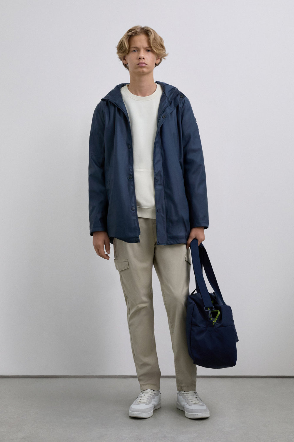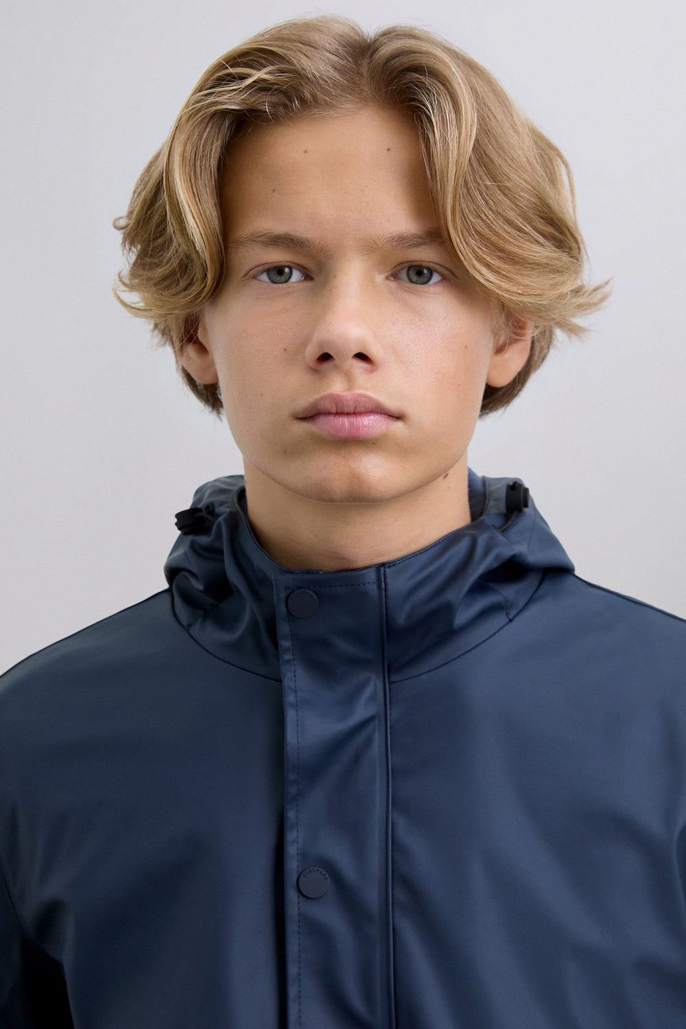 Waterproof parka with adjustable hood. Side pockets with placket and snap button. Synthetic lining. Rubber logo patch detail and skull. Button fastening. Long sleeves.