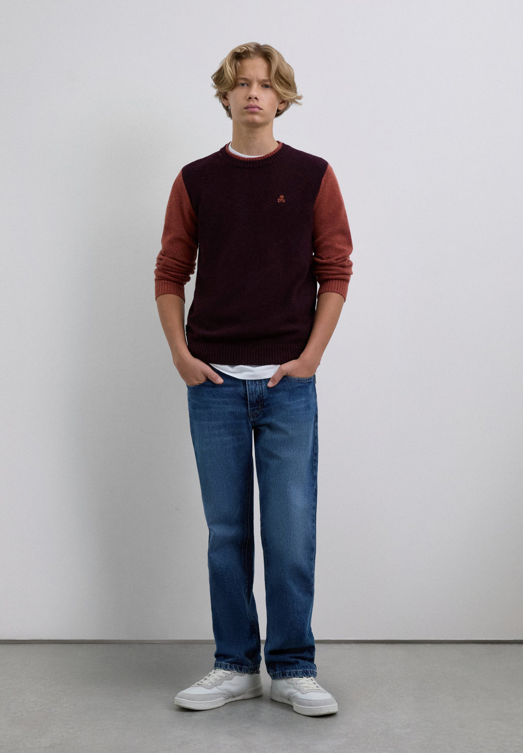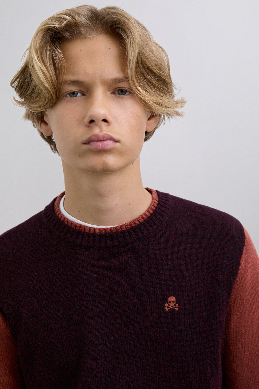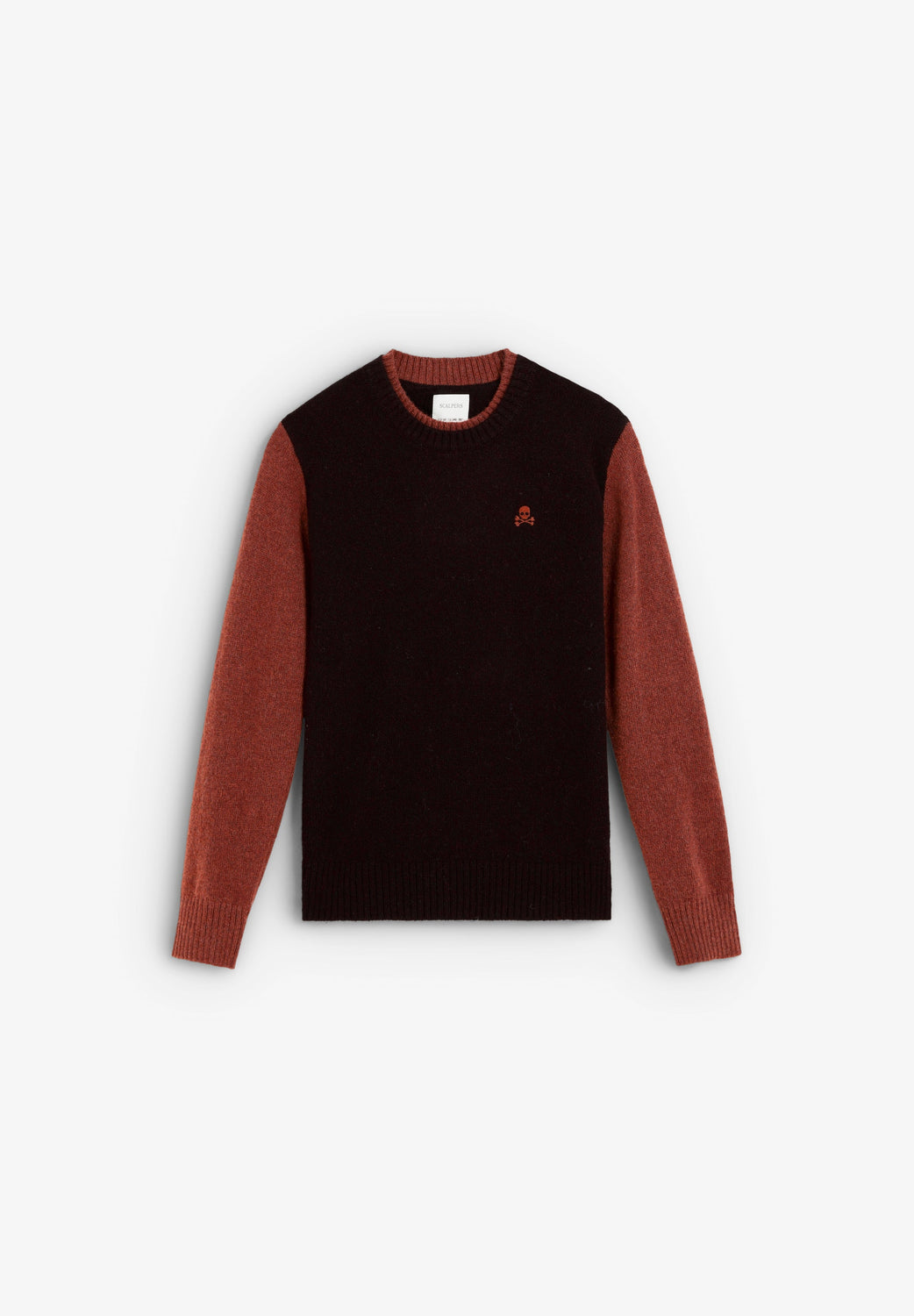Knit sweater. Round neck and contrasting long sleeves. Contrast embroidered logo detail on the chest.