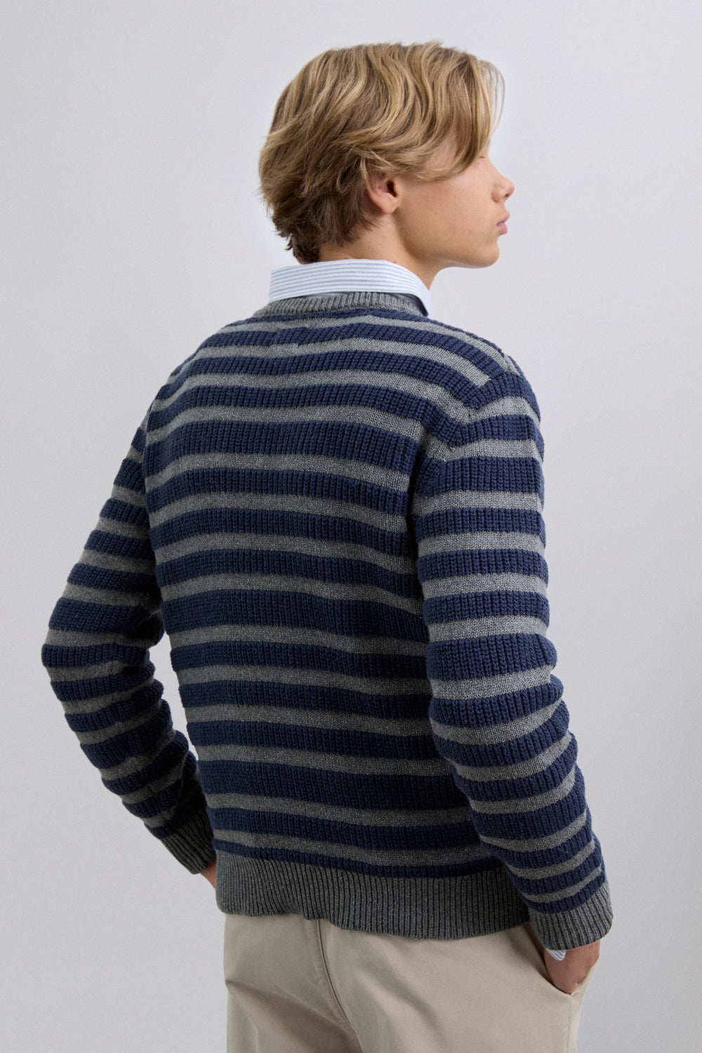 Sweater made of 100% BCI cotton. Stripe print. Round neck. Long sleeves. Ribbed trim.