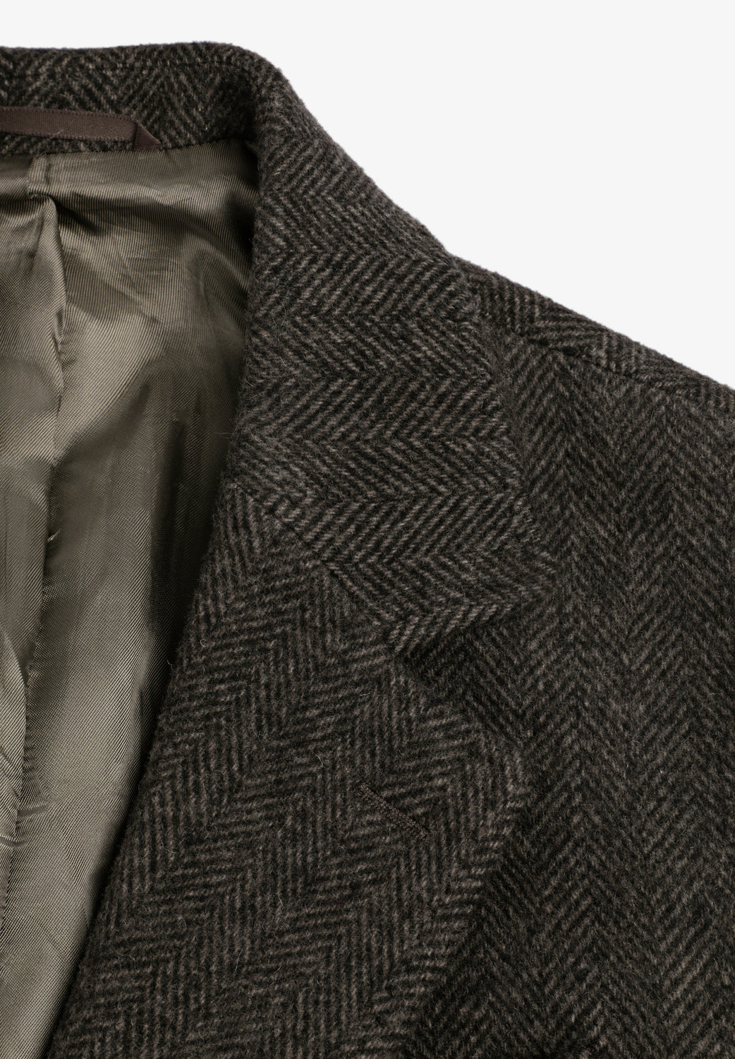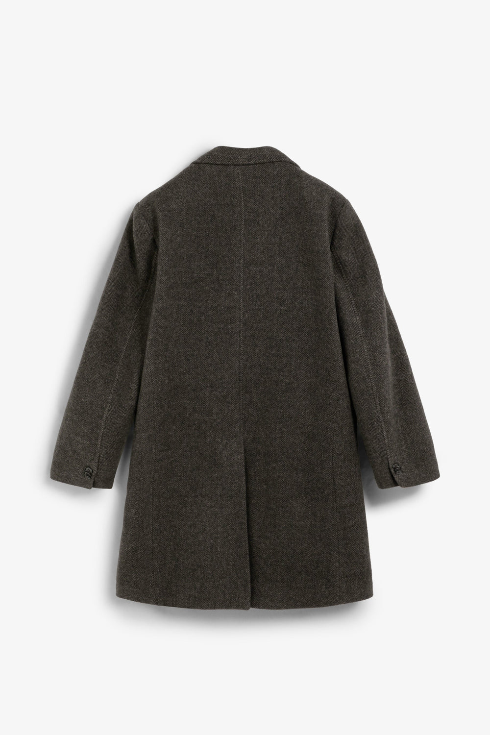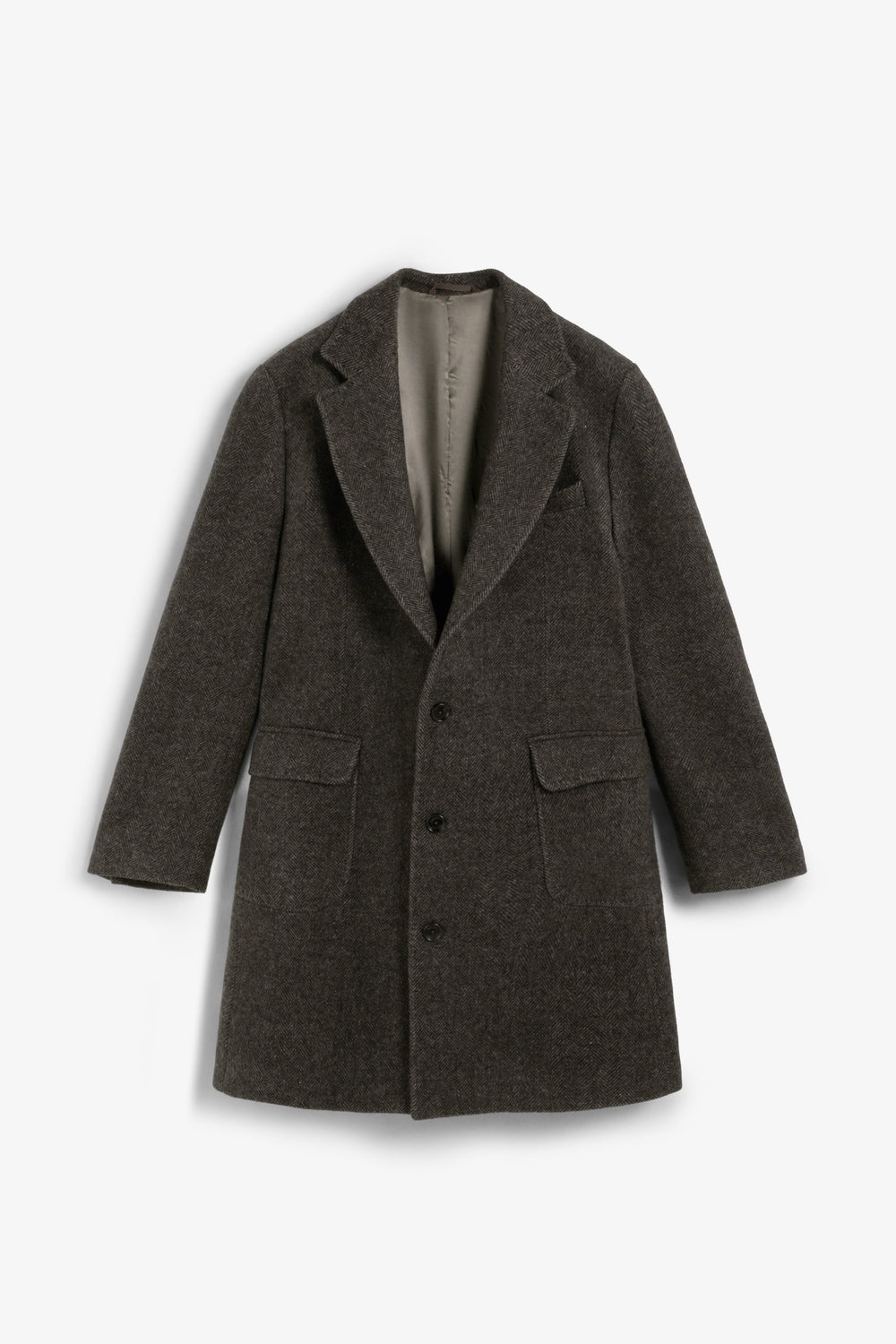 Herringbone woven coat in shades of brown. Lapel collar. Double flap pockets and front button fastening. Brushed feel.