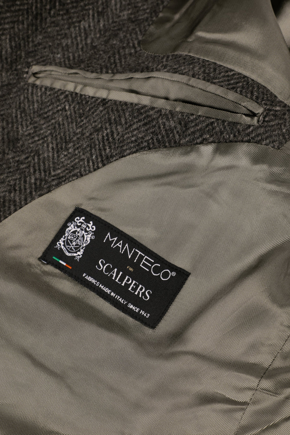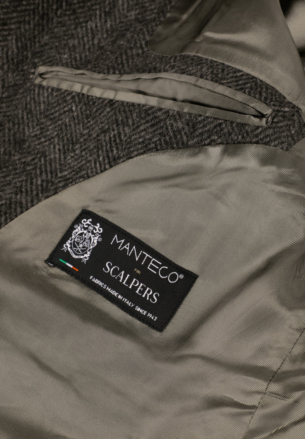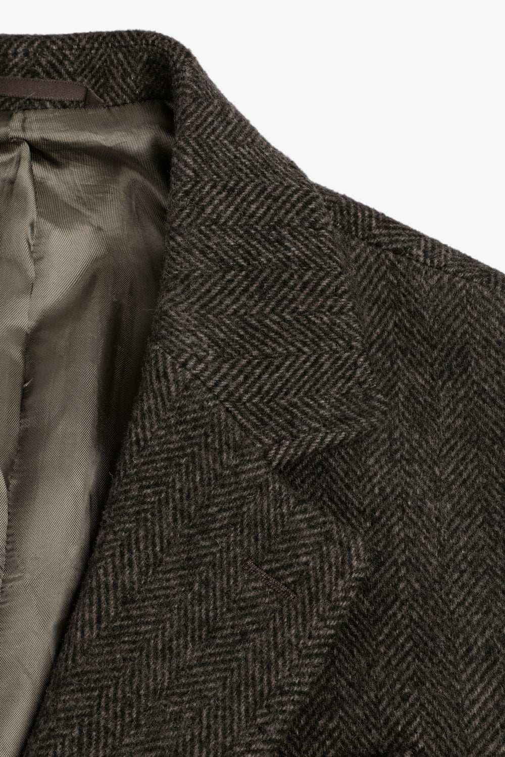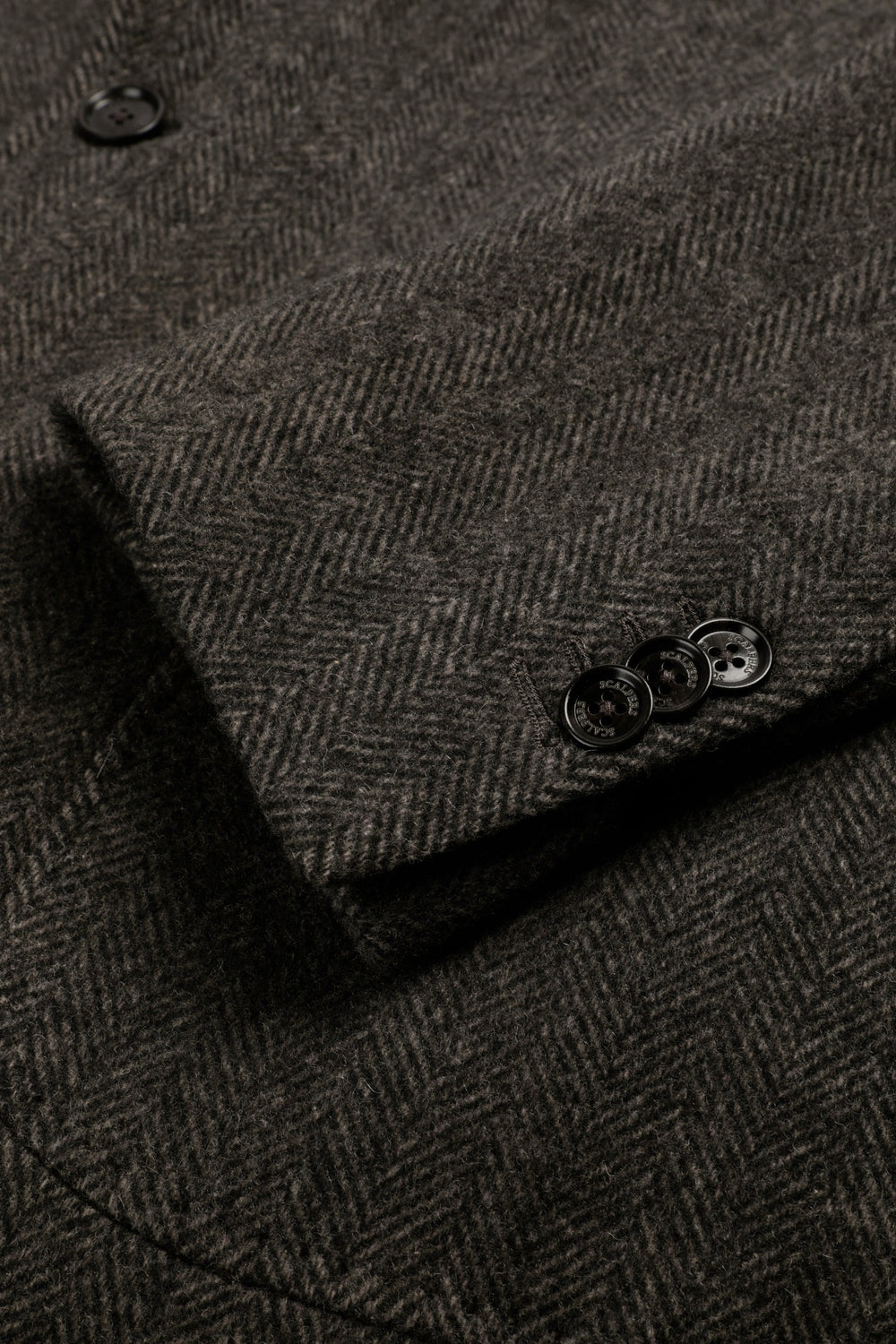Herringbone woven coat in shades of brown. Lapel collar. Double flap pockets and front button fastening. Brushed feel.