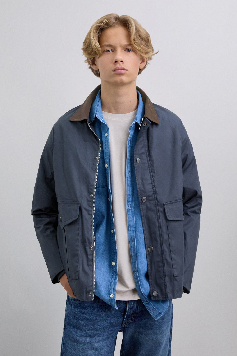 Jacket made of 100% BCI cotton. Contrast corduroy collar. Regular Fit. Long sleeves. Zip and button fastening. Front patch pockets with flap and button fastening.