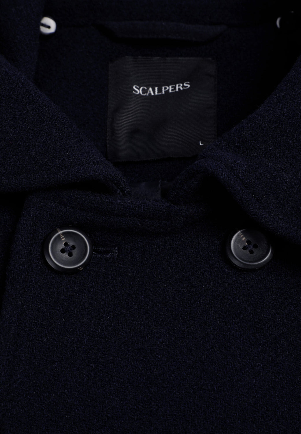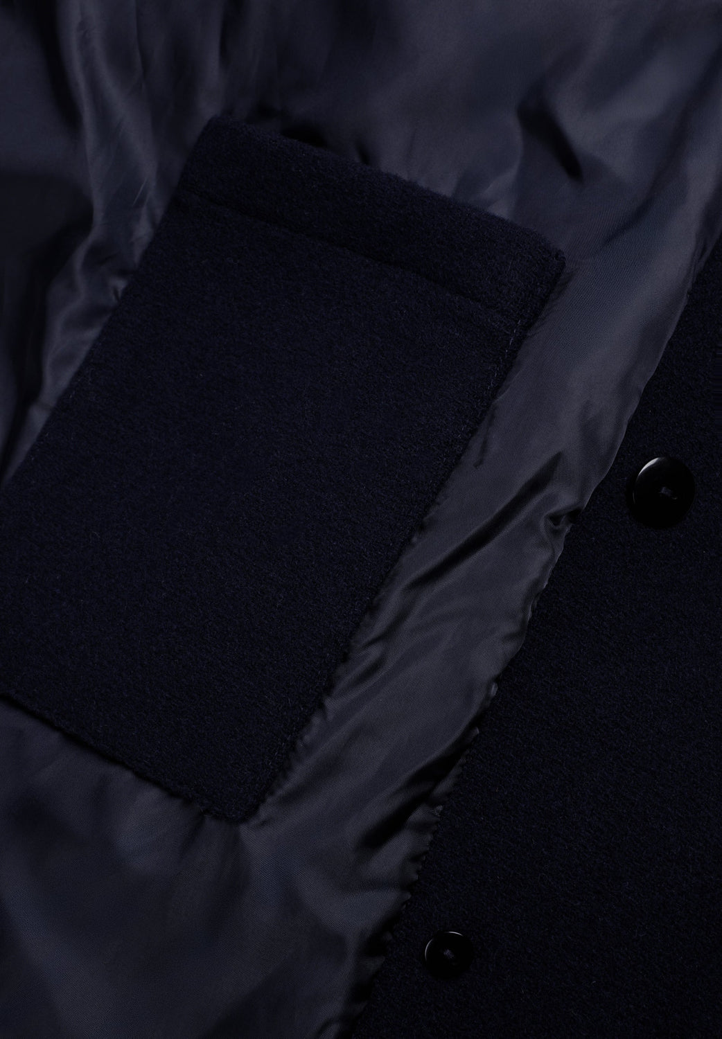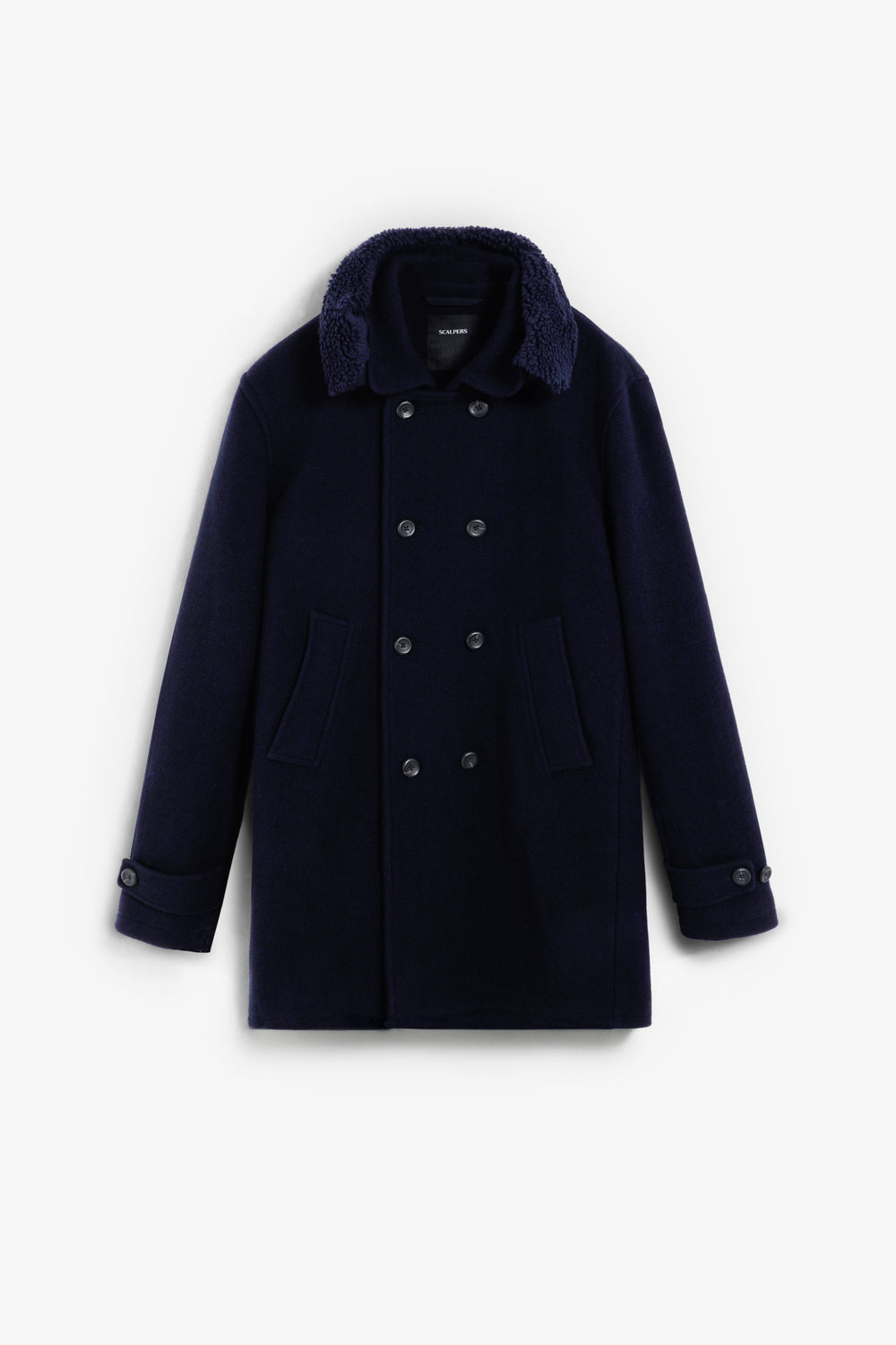 Double-breasted coat made of wool. Button fastening. Cuff detail with tab. Two large, slanted, front welt pockets. Inner pocket. Detachable detail on collar