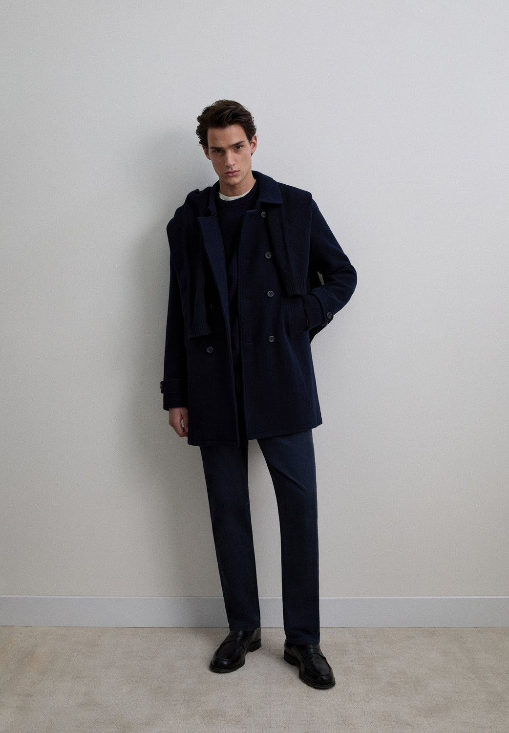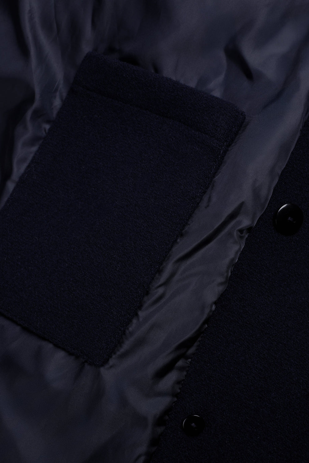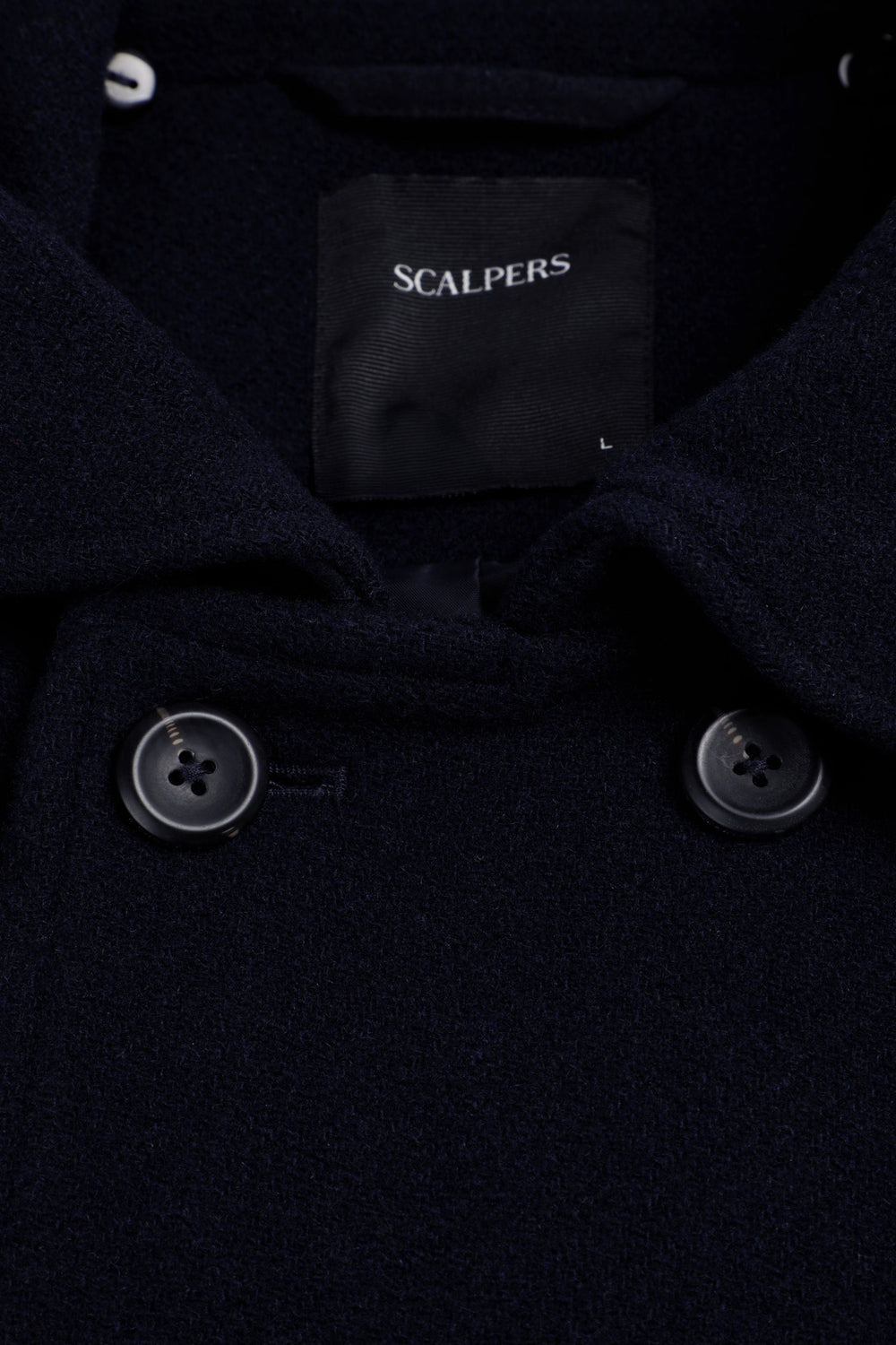 Double-breasted coat made of wool. Button fastening. Cuff detail with tab. Two large, slanted, front welt pockets. Inner pocket. Detachable detail on collar
