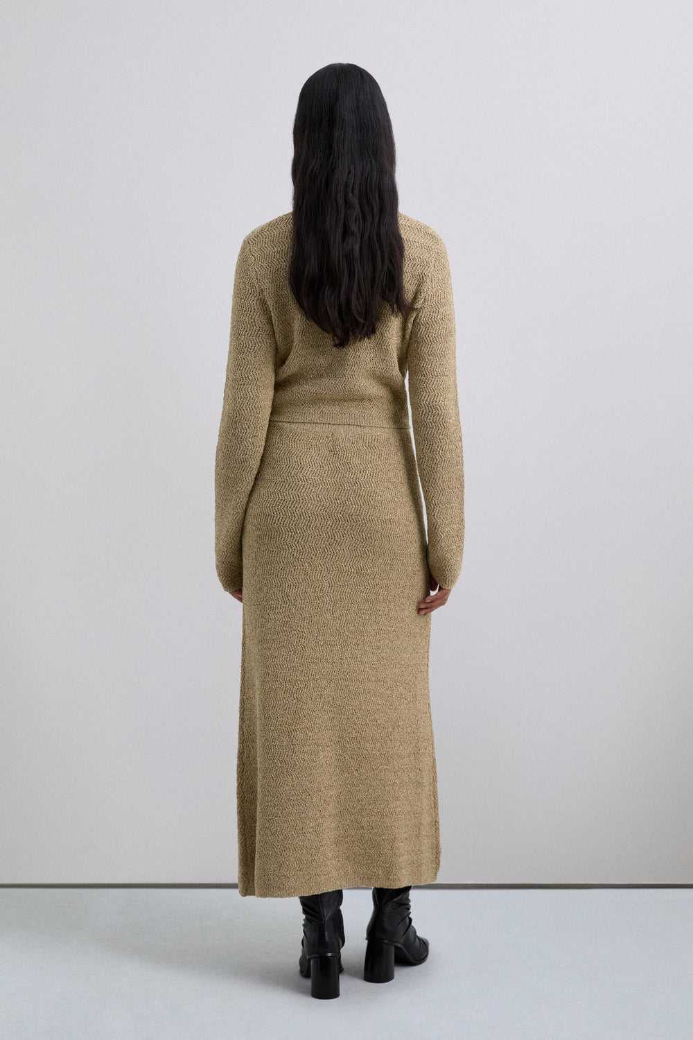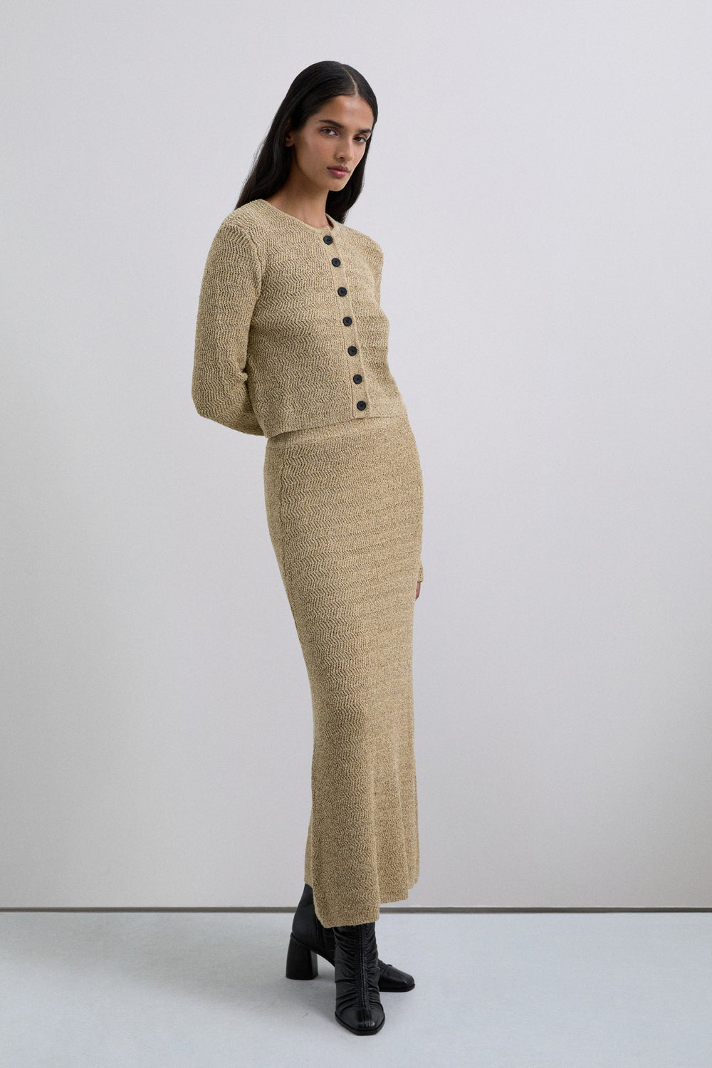 Long skirt made of knitted fabric. Flared. Elasticated waistband.