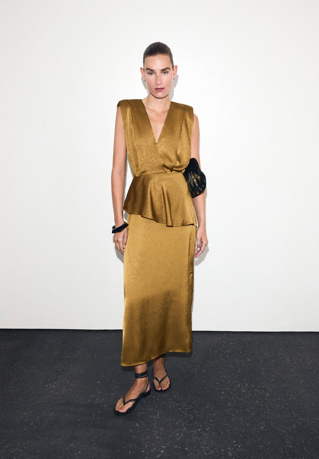 Top confeccionado en tejido fluido con textura. Corte regular fit, escote en V y manga en sisa con ligera hombrera. Plisados en pecho, cogido en cintura y con volante en el bajo.