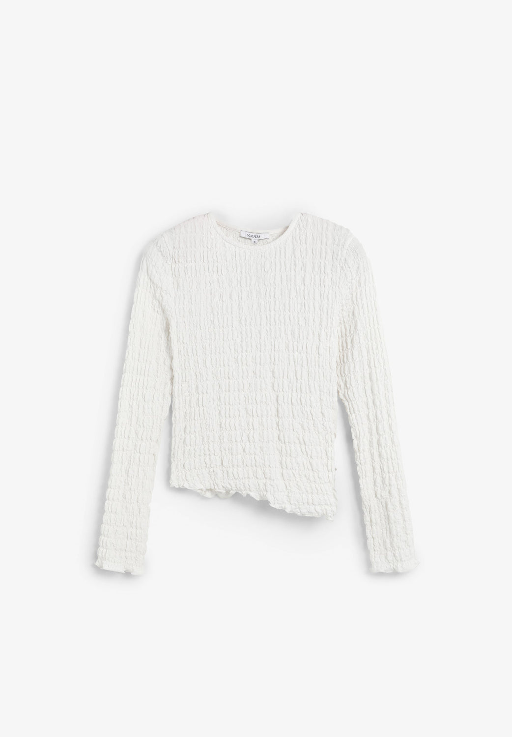 Round neck top with long sleeves. Lightweight fabric with gathered texture.
