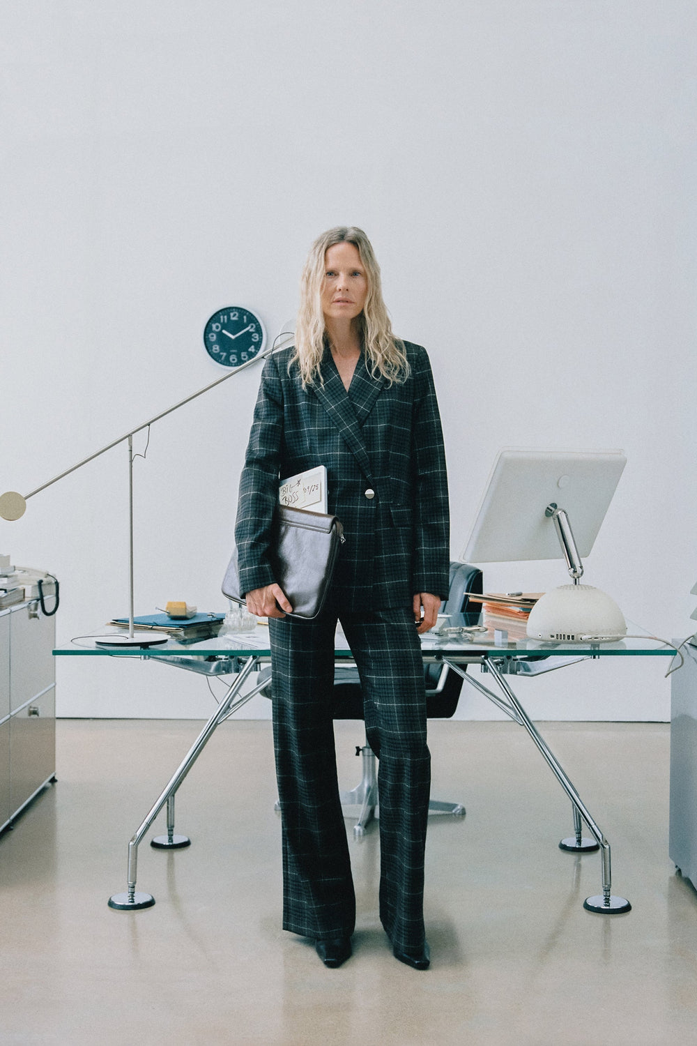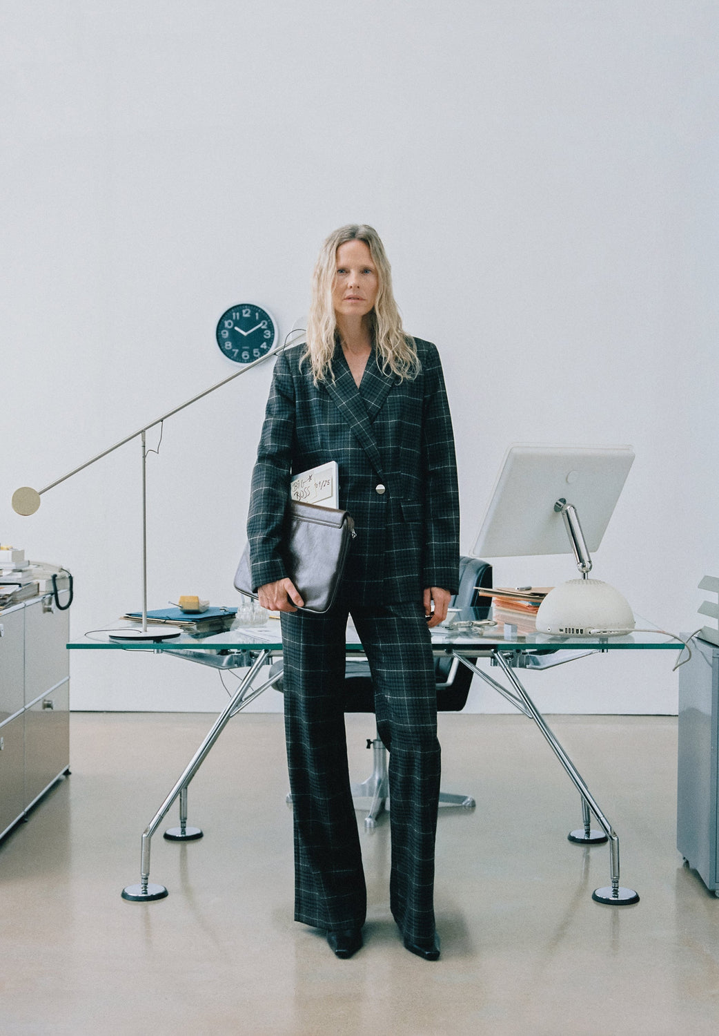 Blazer with pointed lapel. Long sleeves. Double-breasted front button fastening. Two welt pockets. Check print.