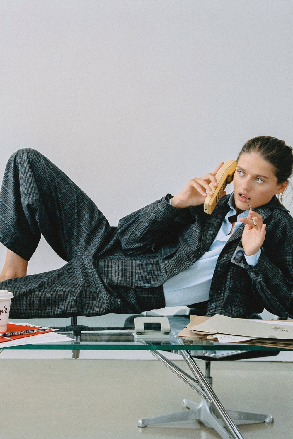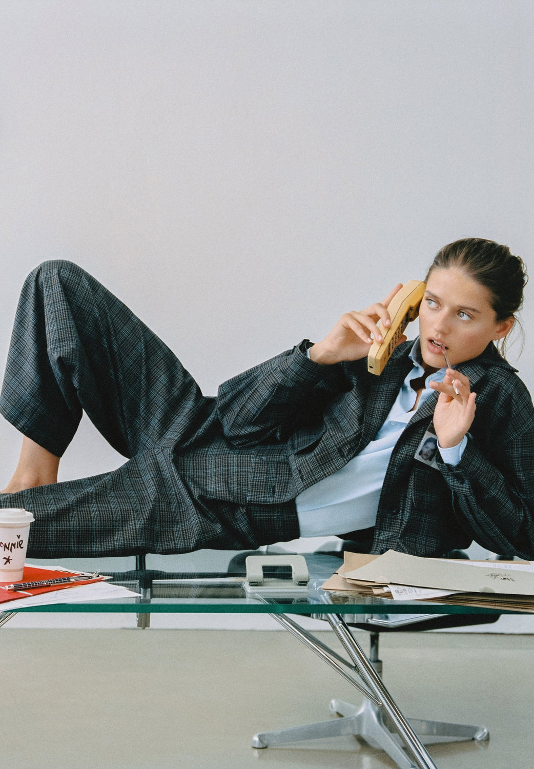 Check print cardigan. Shirt collar. Long sleeves. Waist adjusters. Cuffs with button fastening. Front button fastening.