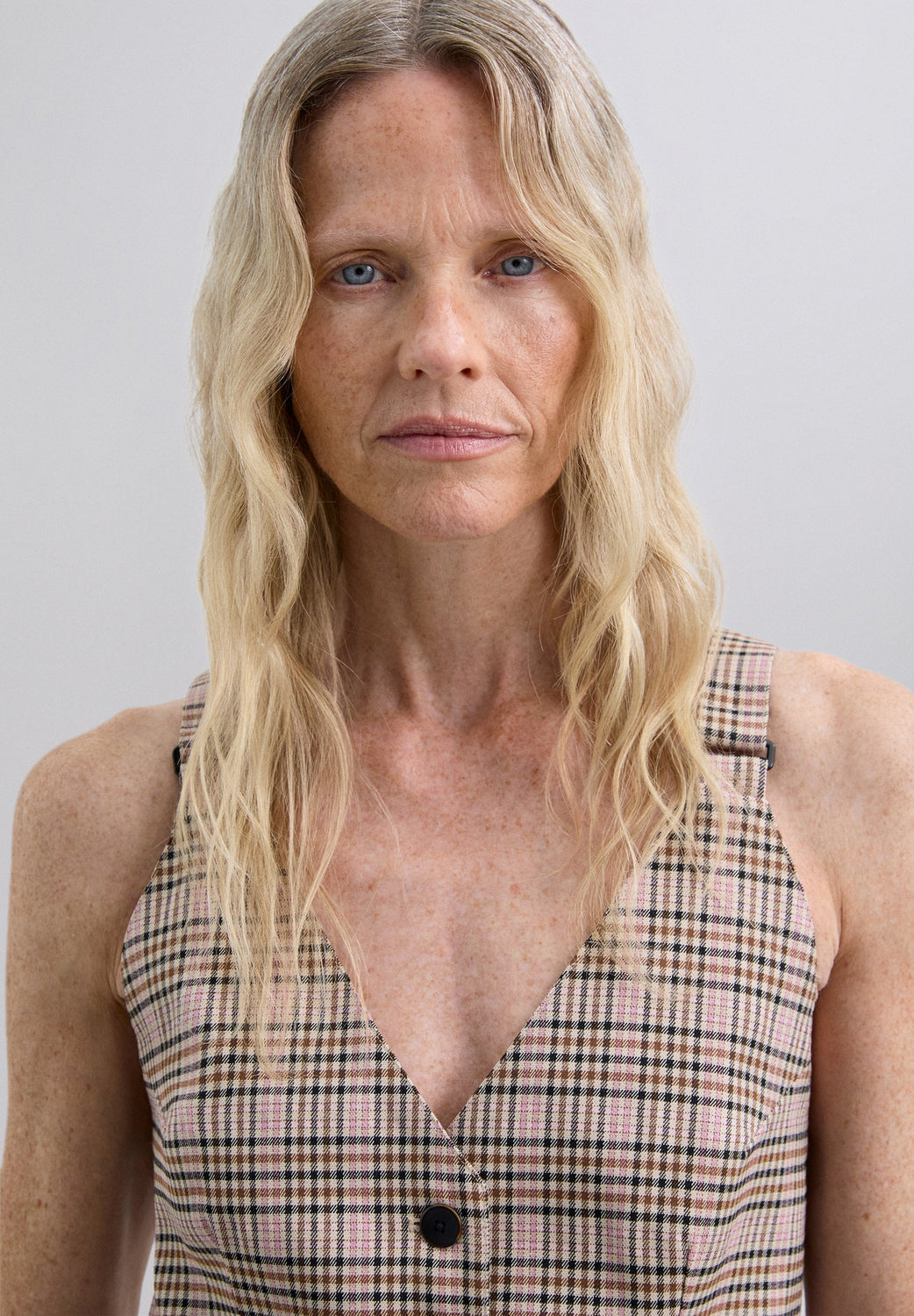 Coat with check print. V-neckline. Multipurpose straps. Front button fastening. Two front pockets.