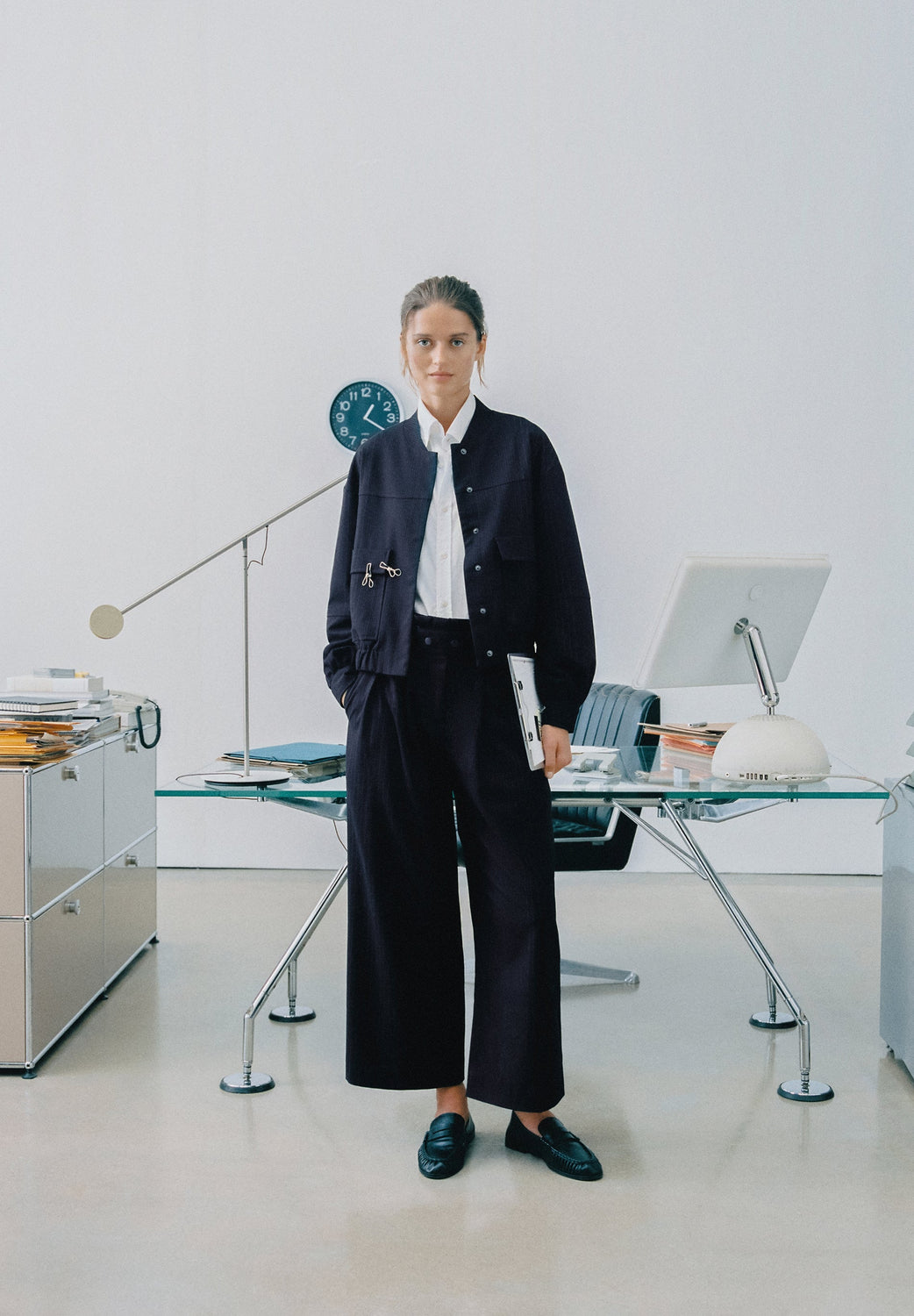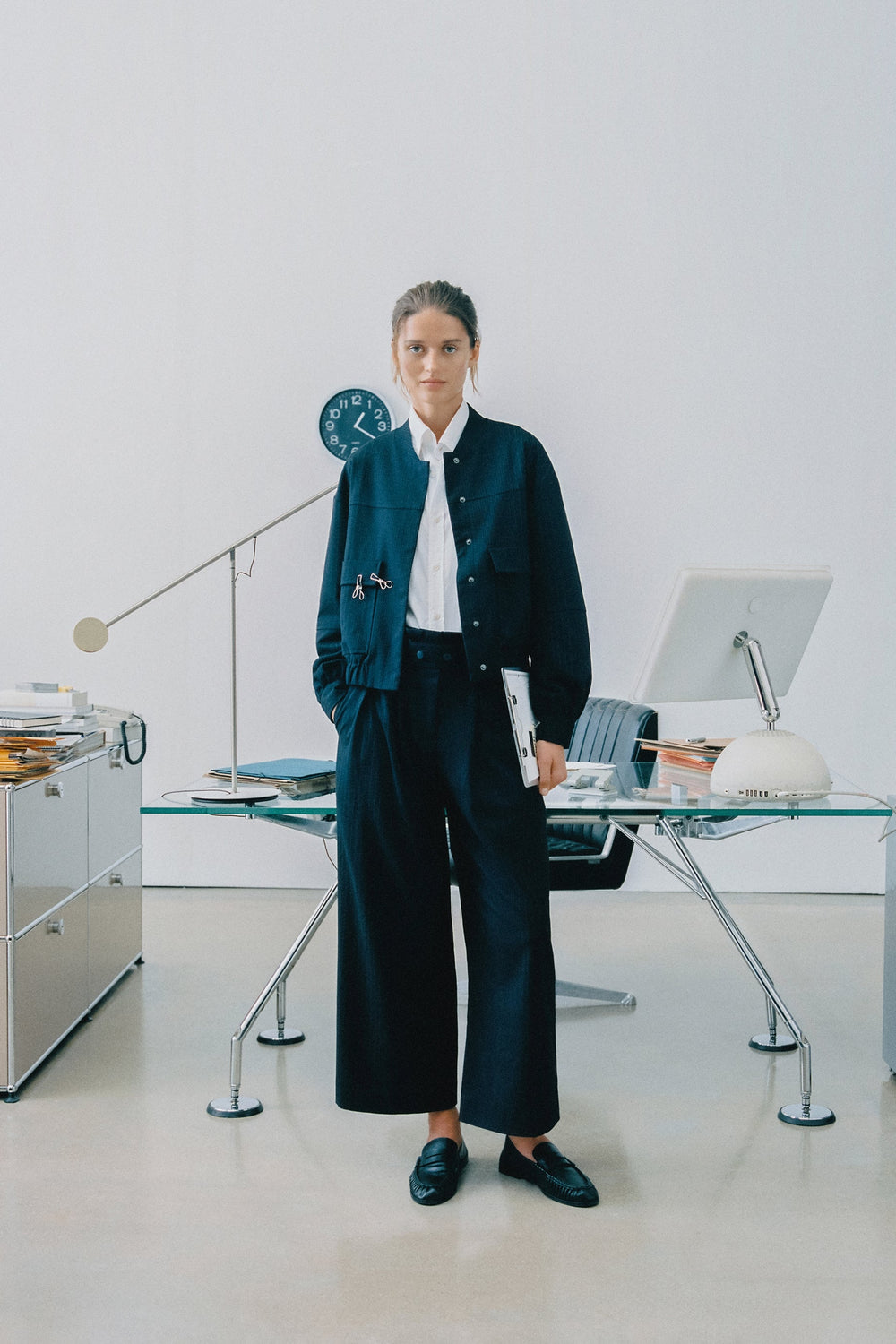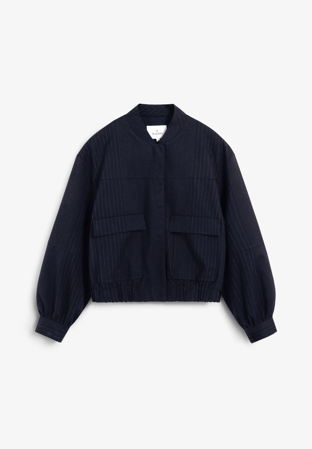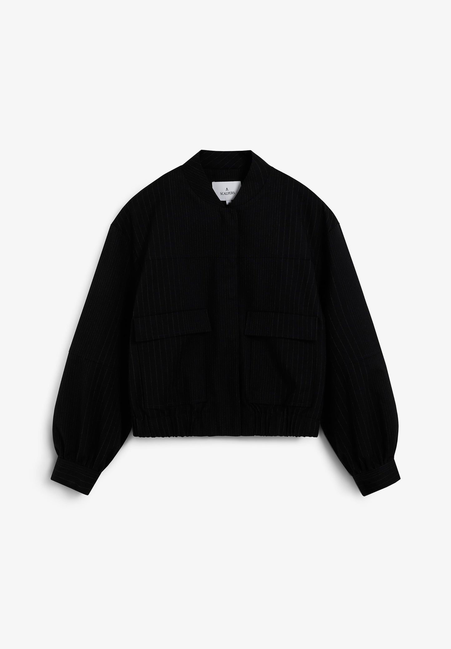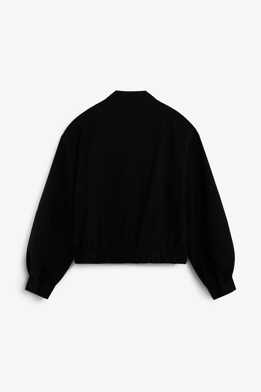 Pinstripe bomber jacket. Shirred stand-up collar. Long sleeves. Slightly stretchy waist. Front zip and button fastening. Two back pockets with flaps.