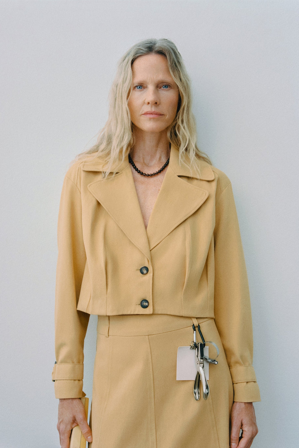 Chaqueta corta ligera confeccionada en 100% algodón con solapa de punta y cierre de botones en la parte frontal. Manga larga con terminación cerrada con botones.