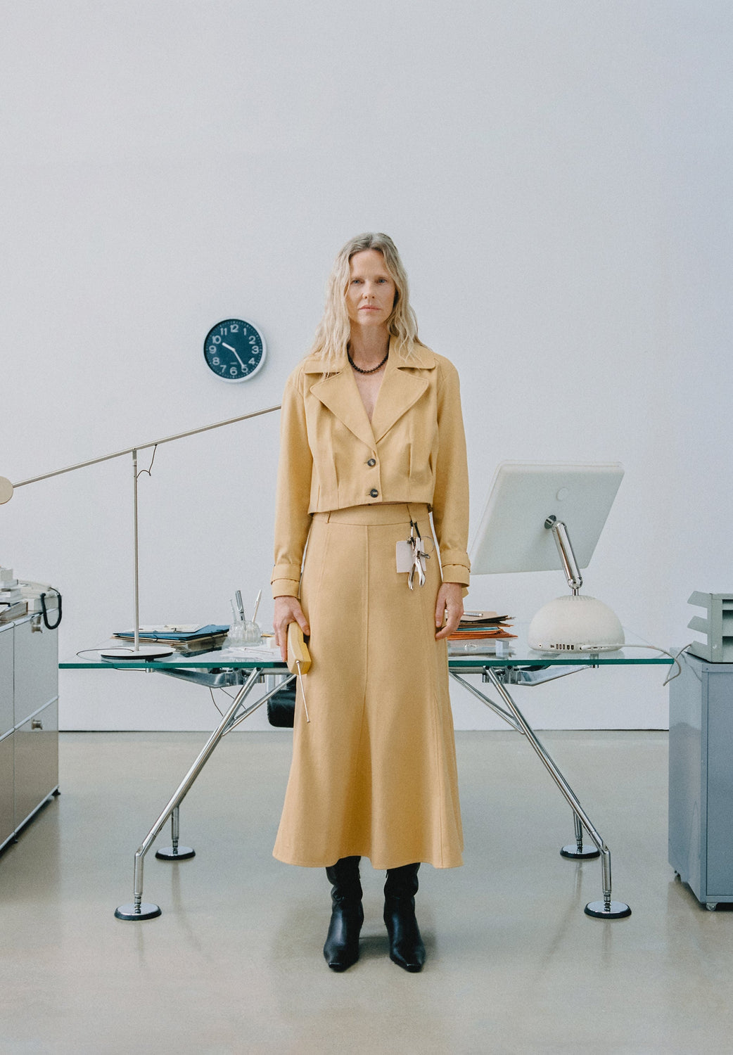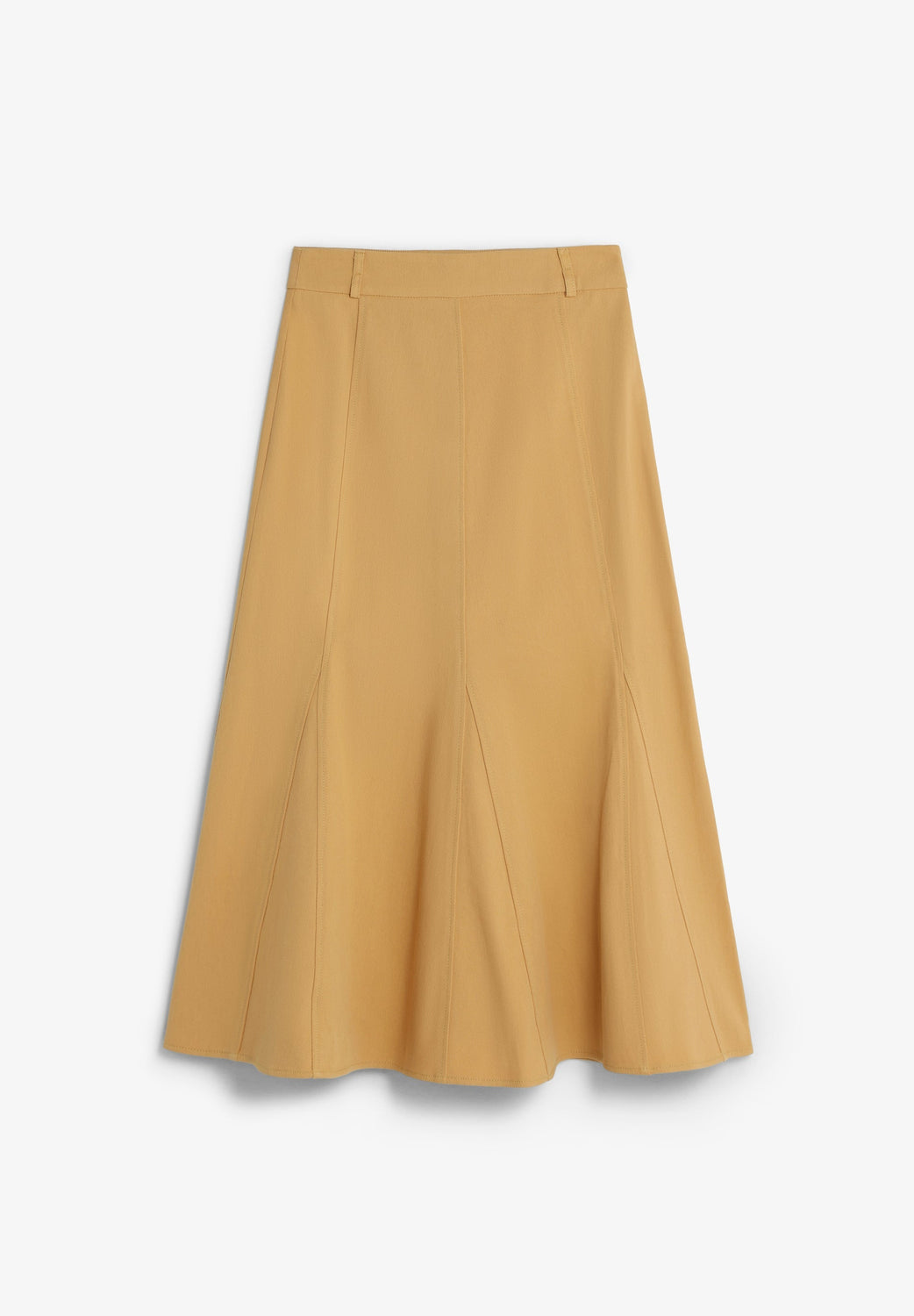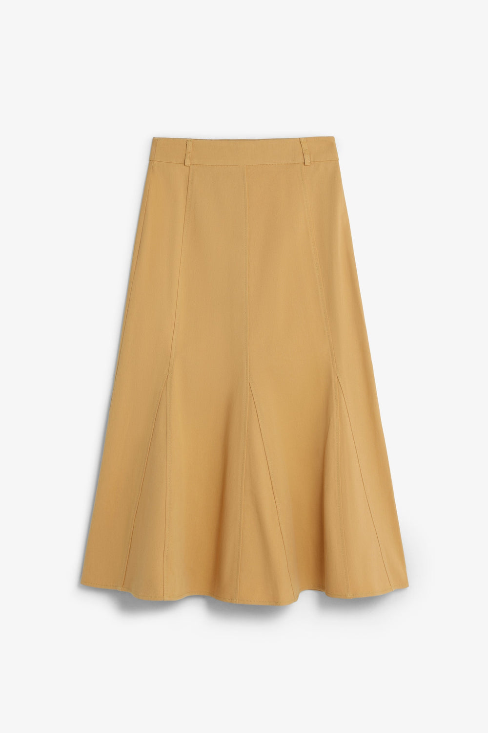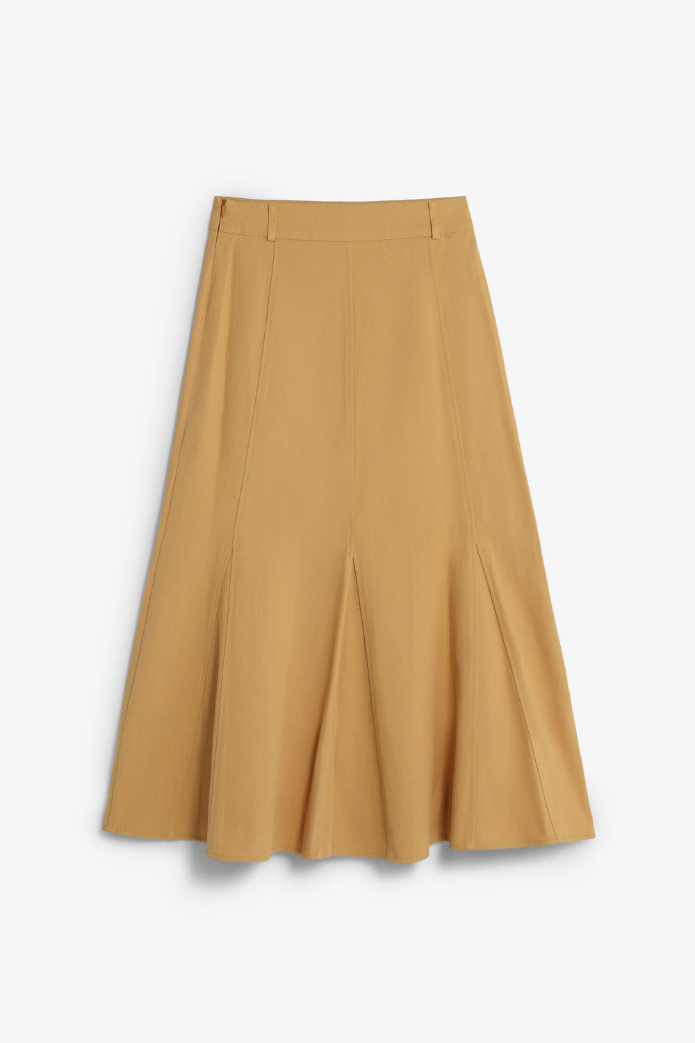 Falda confeccionada en 100% algodón con trabillas, cintura elástica y pliegues. Forro interior combinado. Cierre lateral con cremallera oculta.