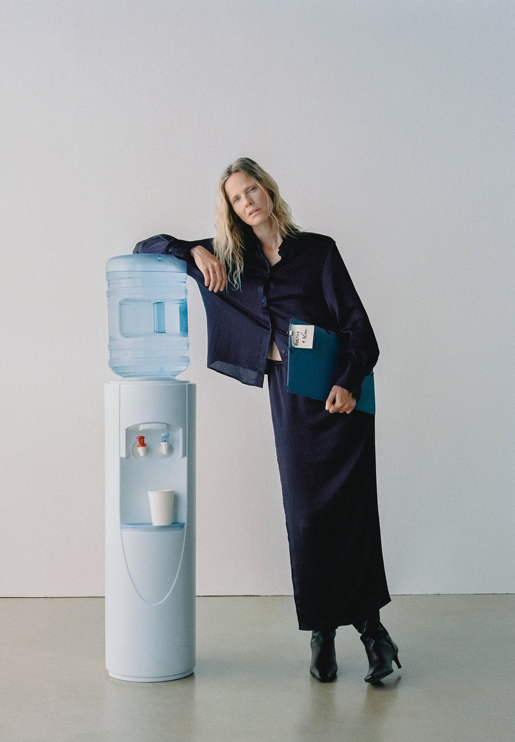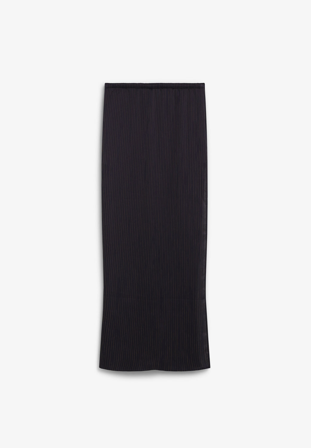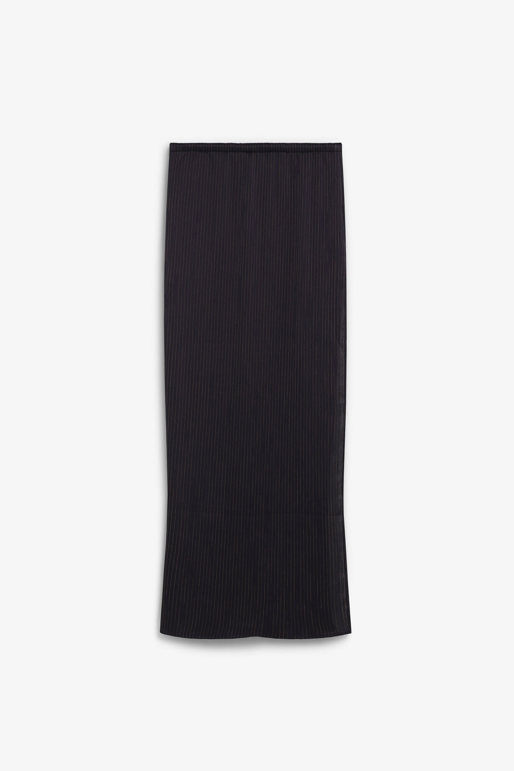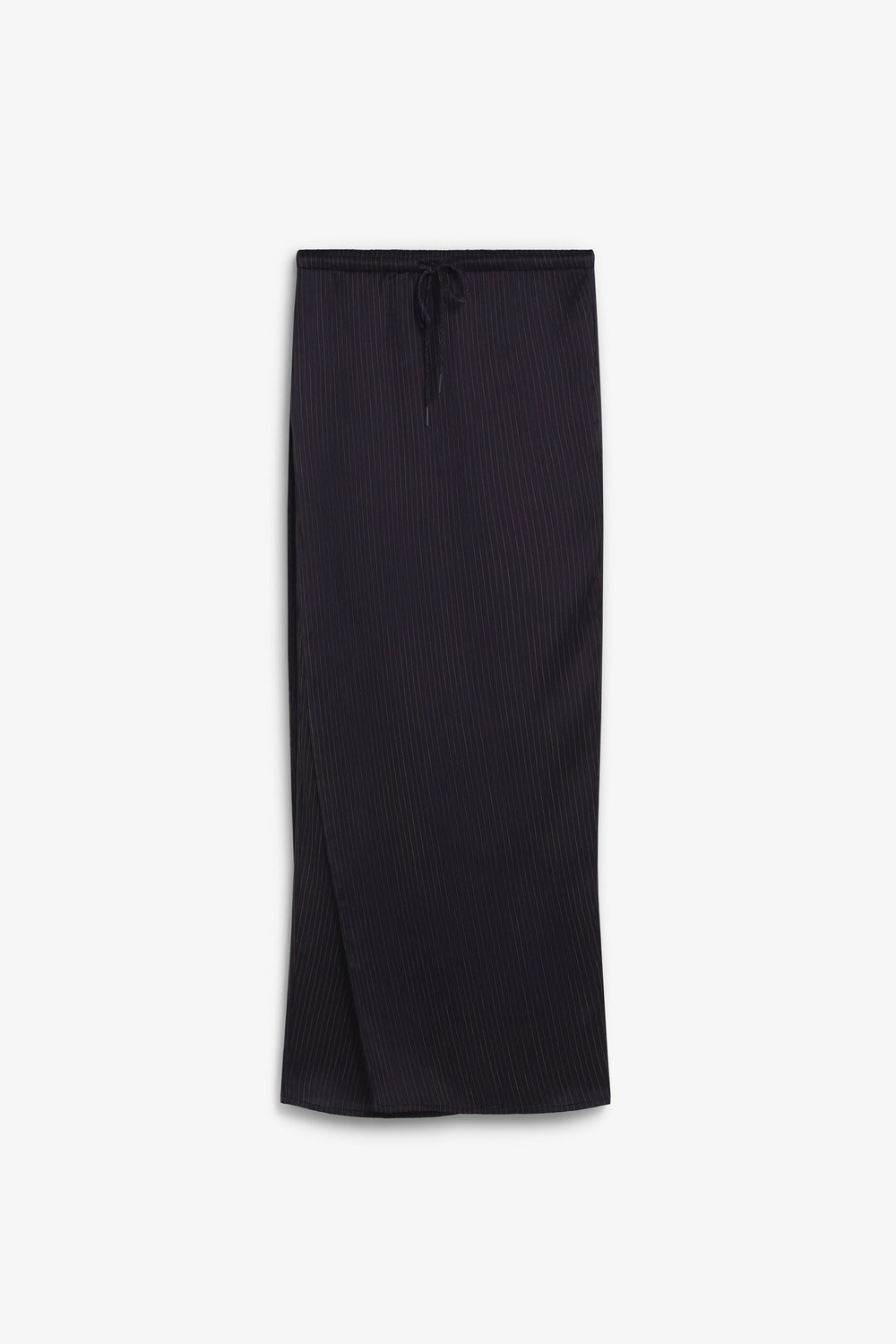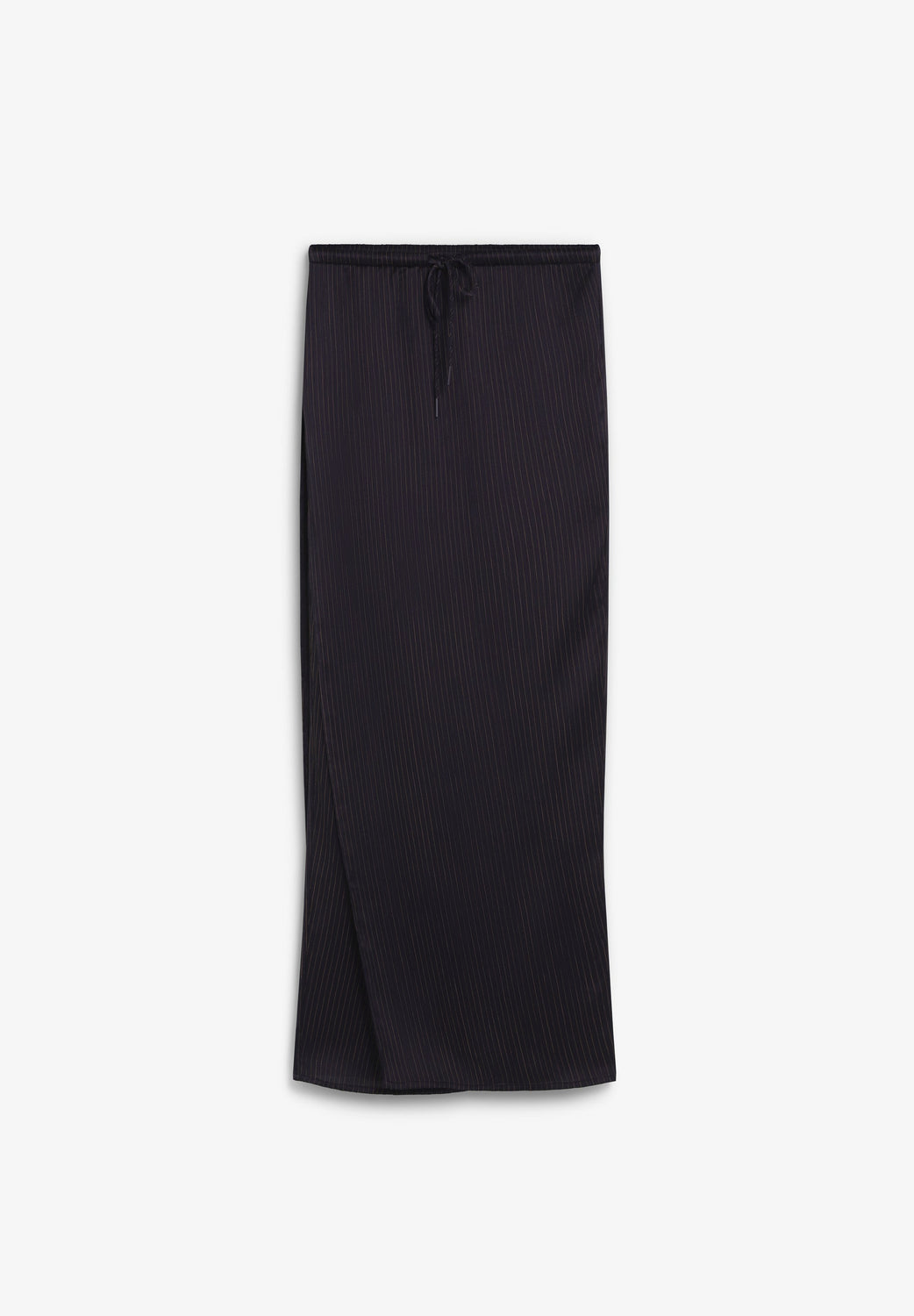 Long pinstripe skirt. Elastic waistband with adjustable drawstring Straight cut with side slit