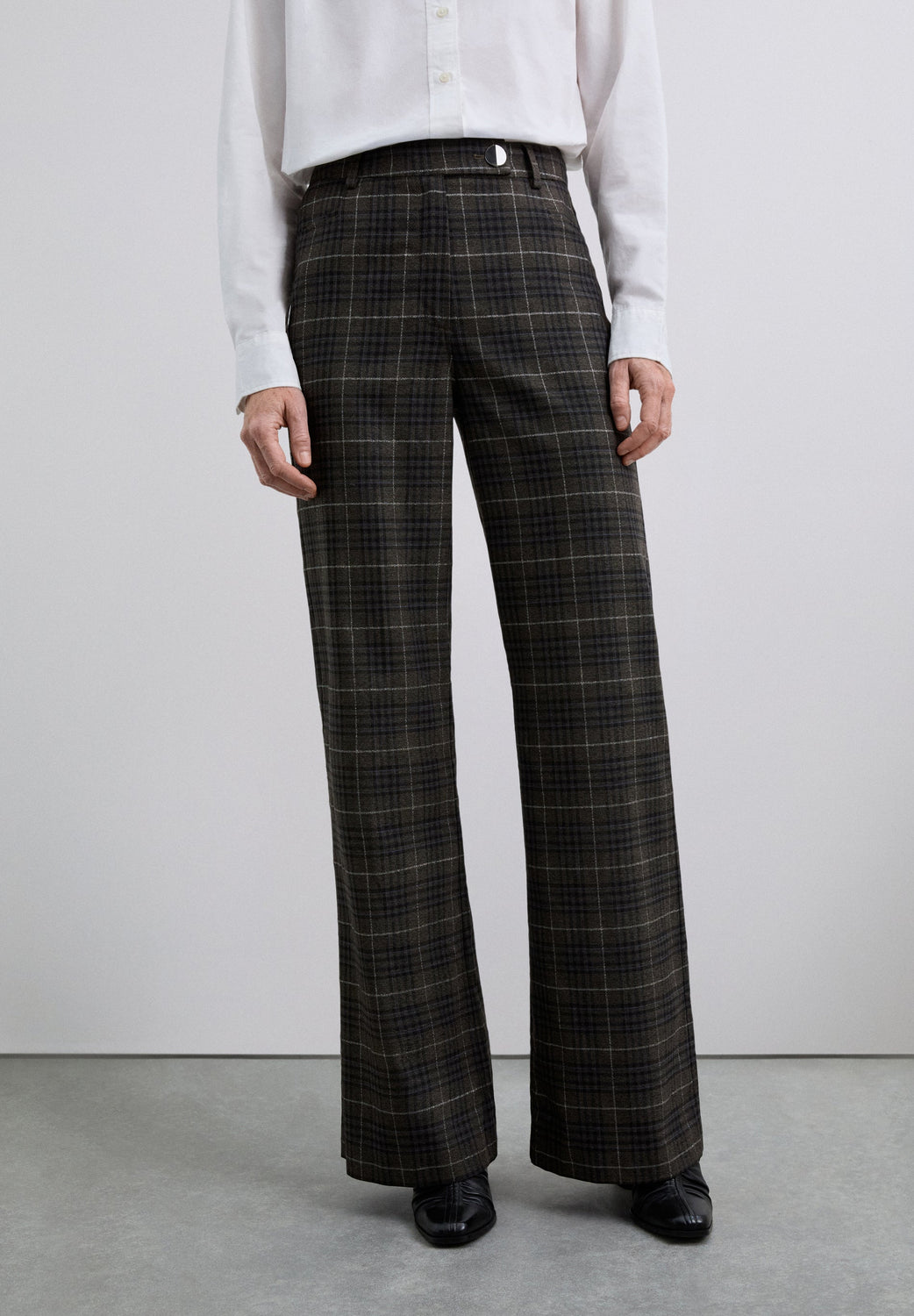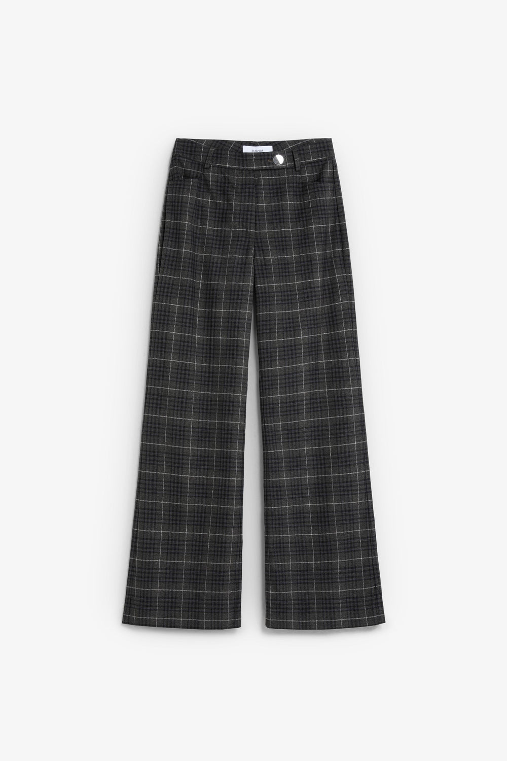 Straight jeans. Front zip and button fastening. Two flap pockets at the back. Belt loops at the waist. Check print.
