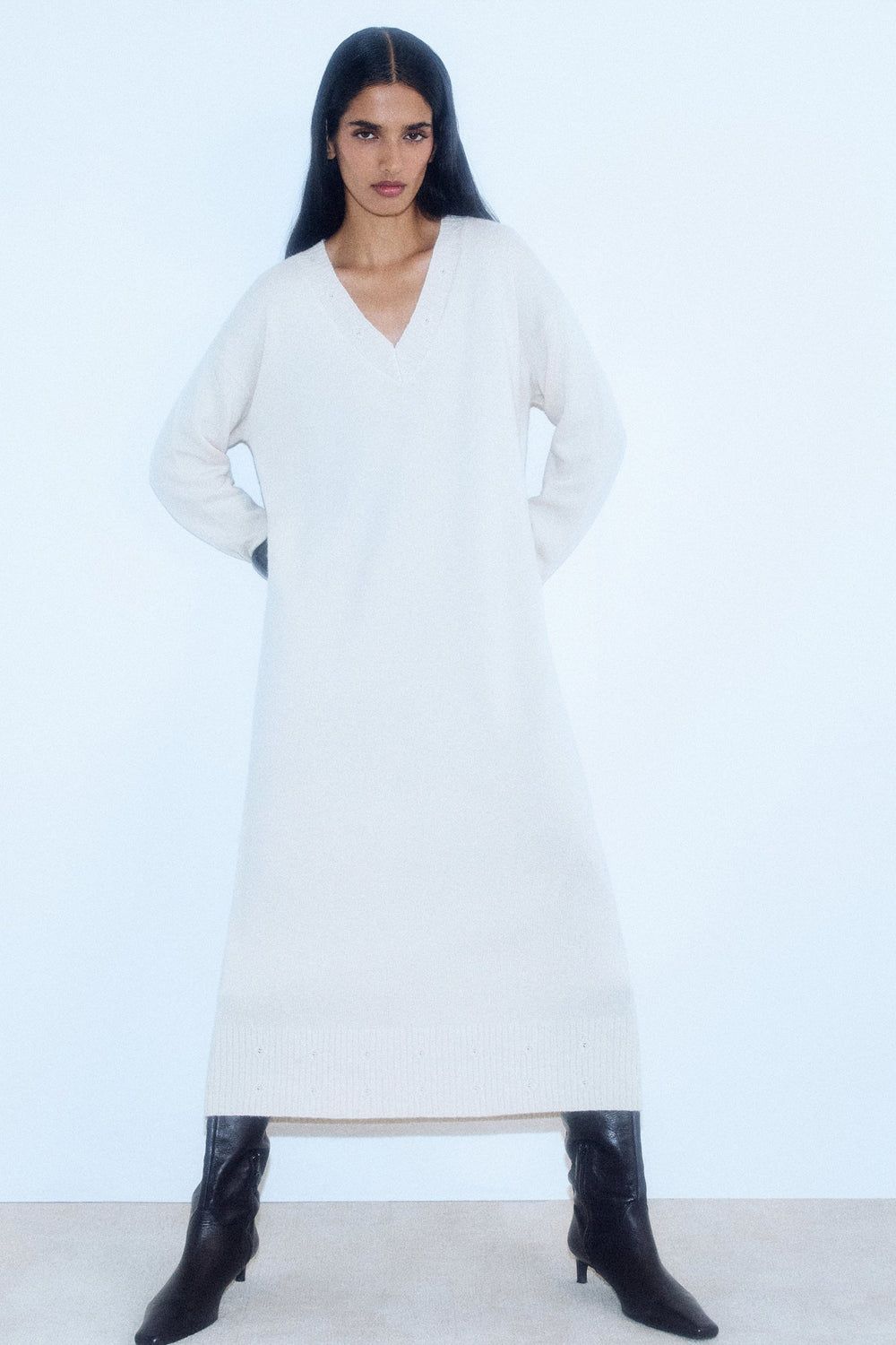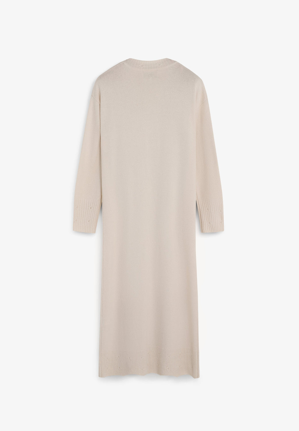 Loose fit midi-length dress with V-neckline and long sleeves. Special stitching details on the neckline, cuffs and hem. Mini holes around the bottom.