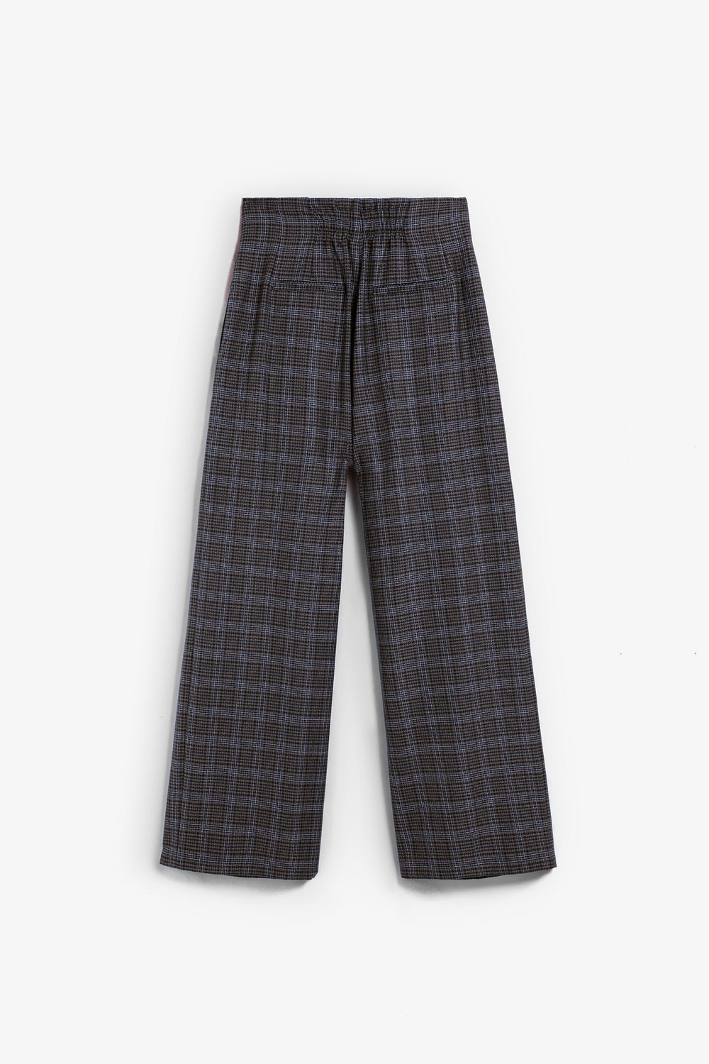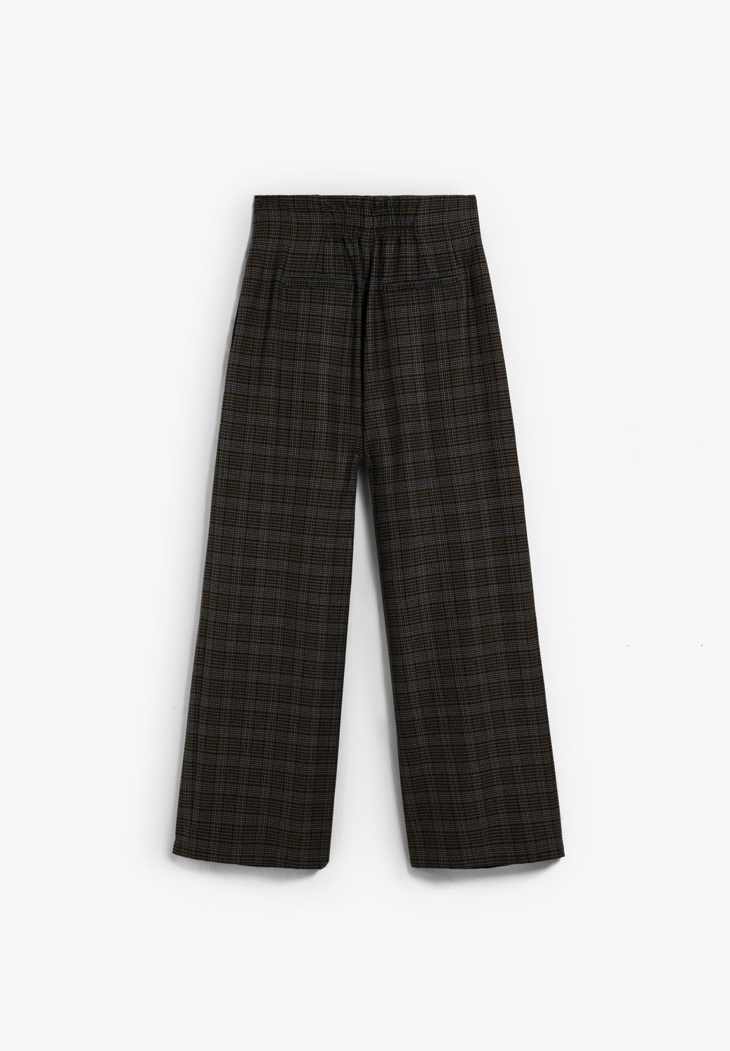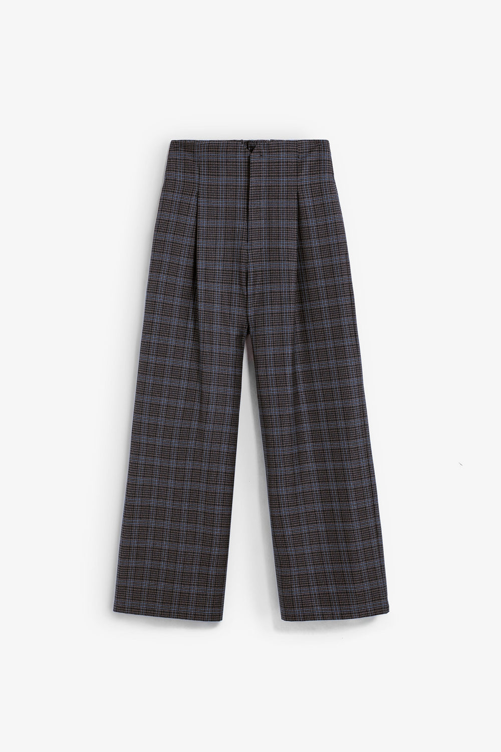 Culotte cut trousers. Pleat detail on the front. Concealed zip and button fastening. Check print.