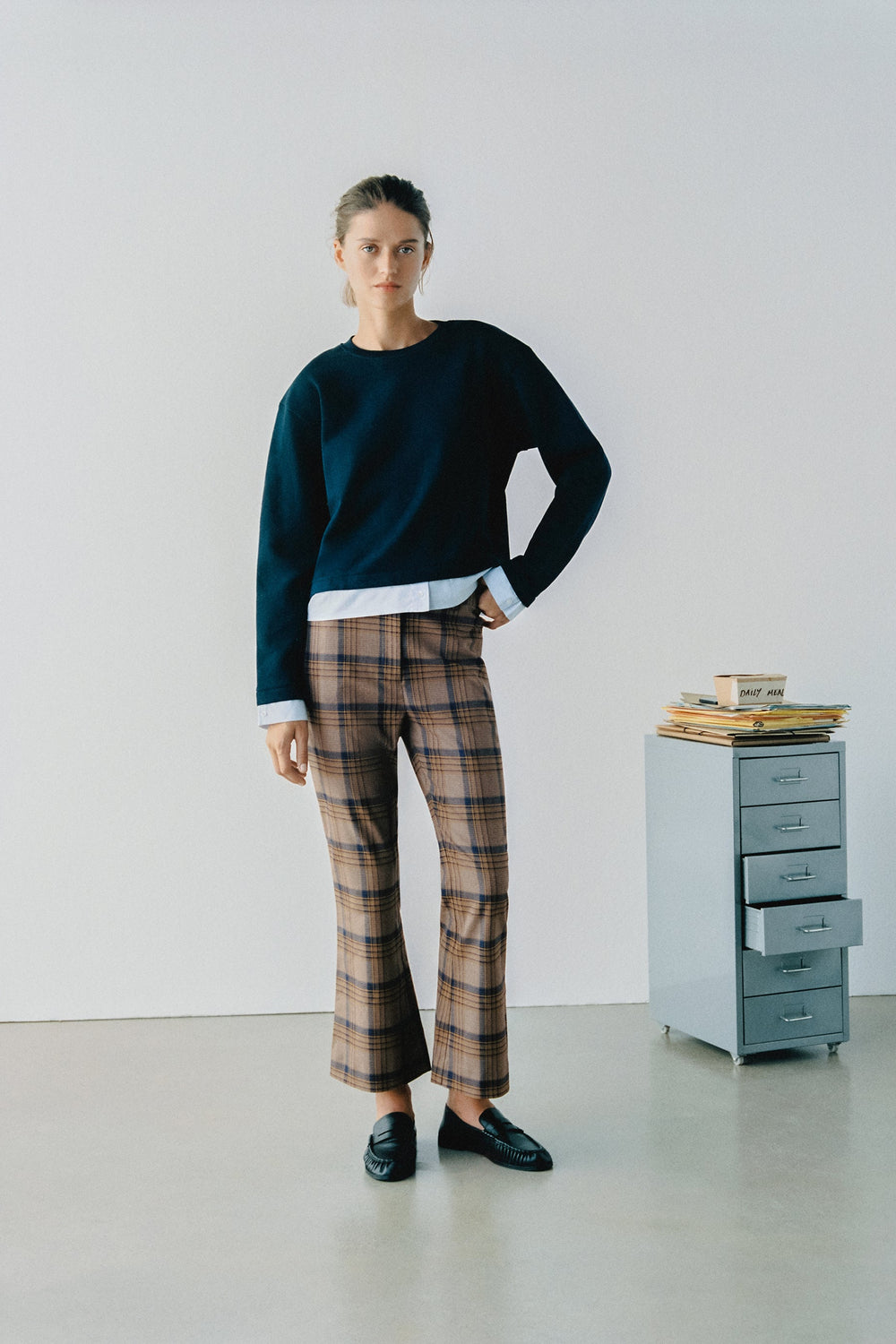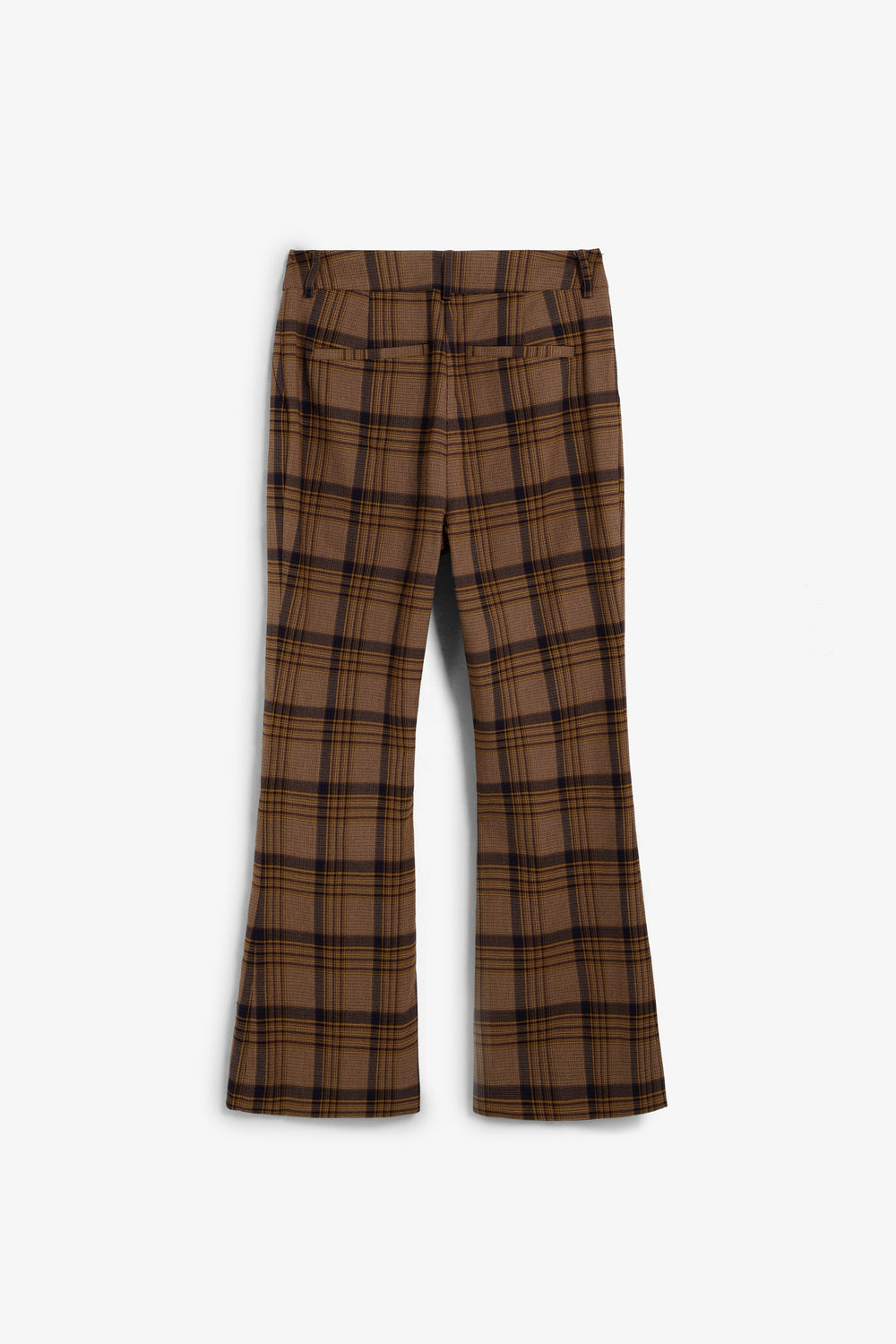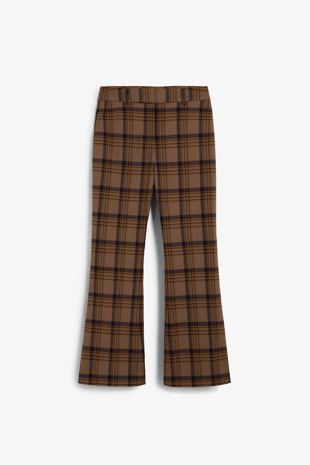Ankle-length flare trousers. Check print. Two side pockets and at the back. Concealed zip and hook fastening. Belt loops at the waist.