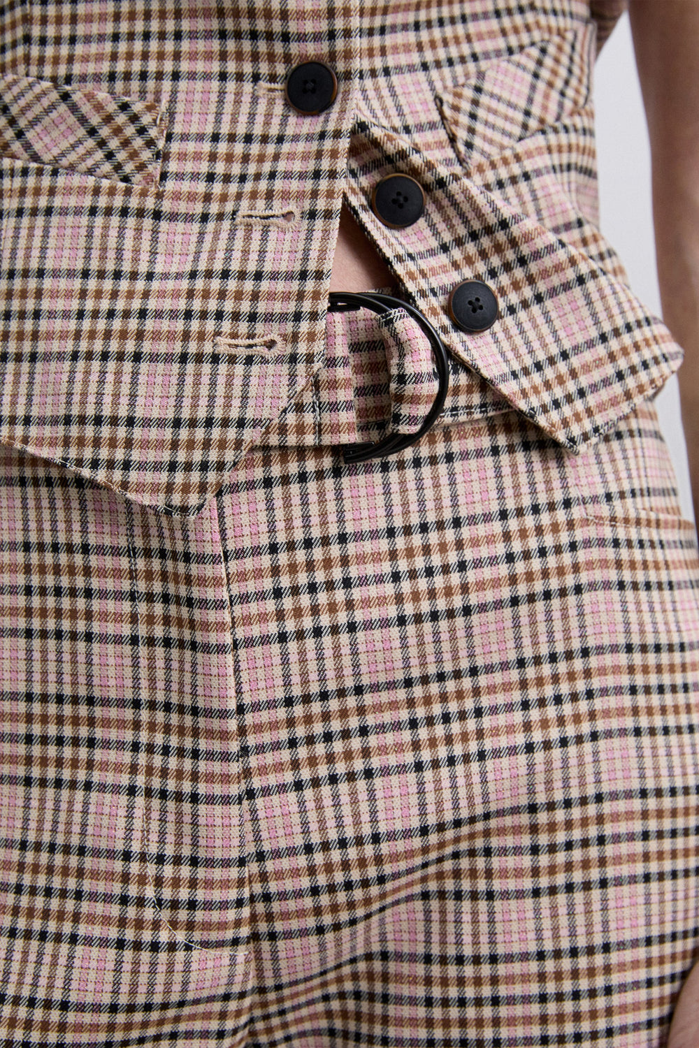 Flared trousers. Front pockets. Flap pocket at the back. Belt loops at the waist. Check print.