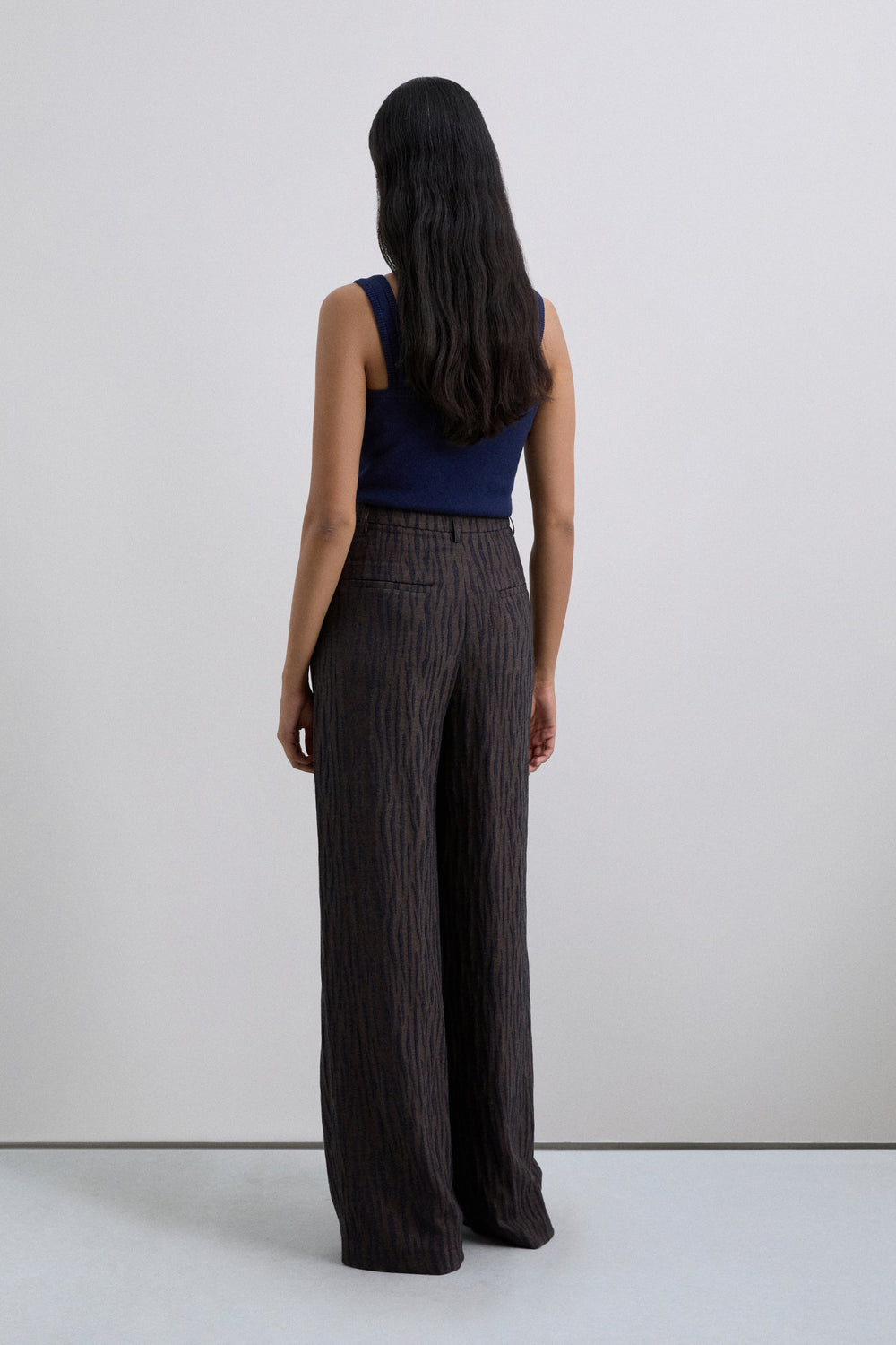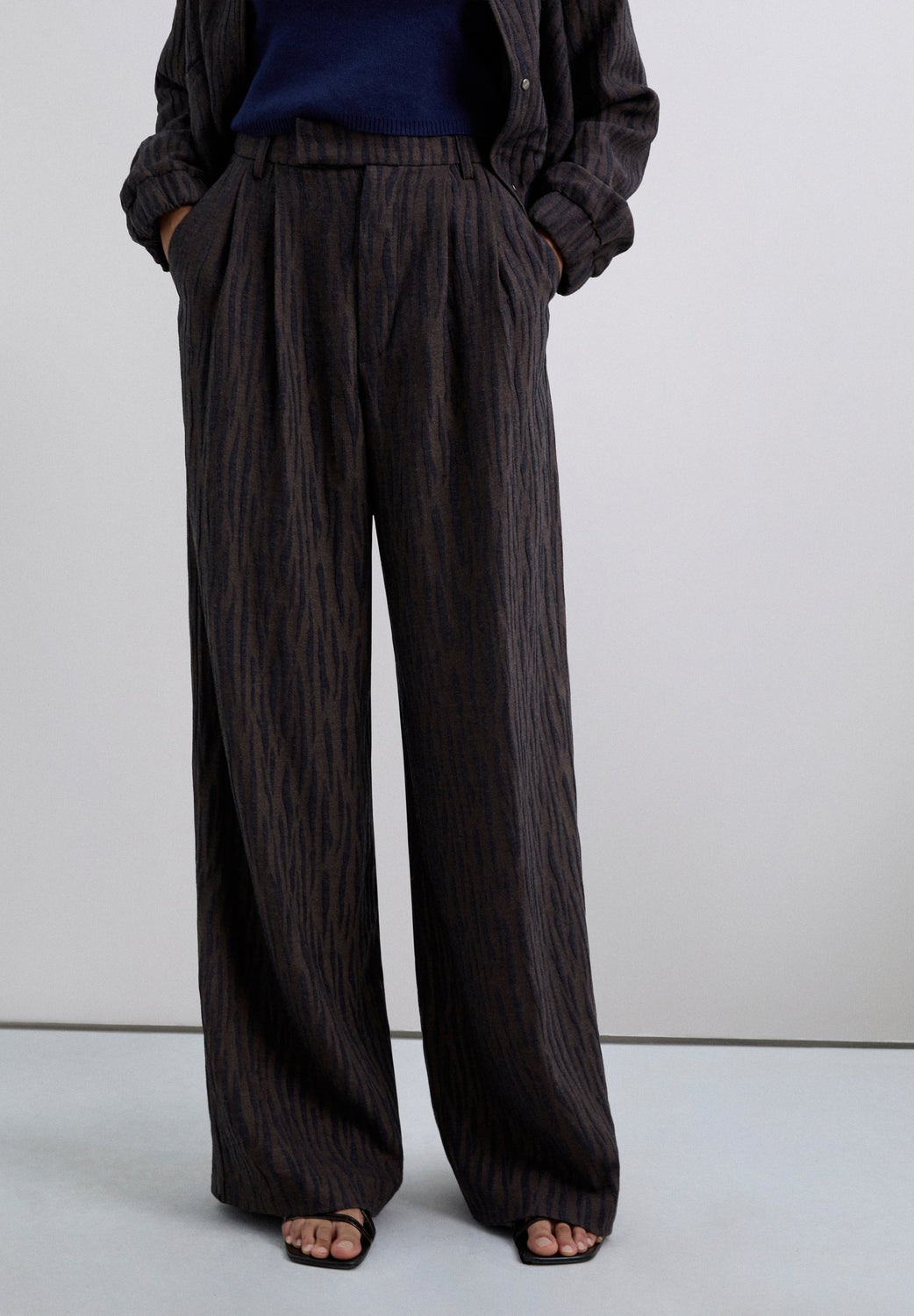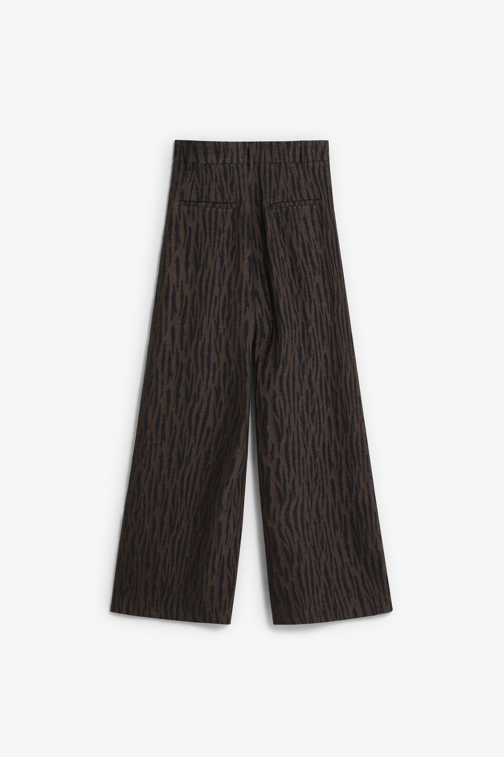 Pantalones con cierre de cremallera oculto por una solapa, con gancho y botón. Dos bolsillos laterales. Detalle de doble pinza en la parte frontal. Tela de jacquard con estampado animal.