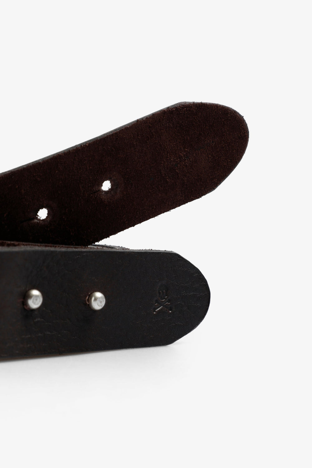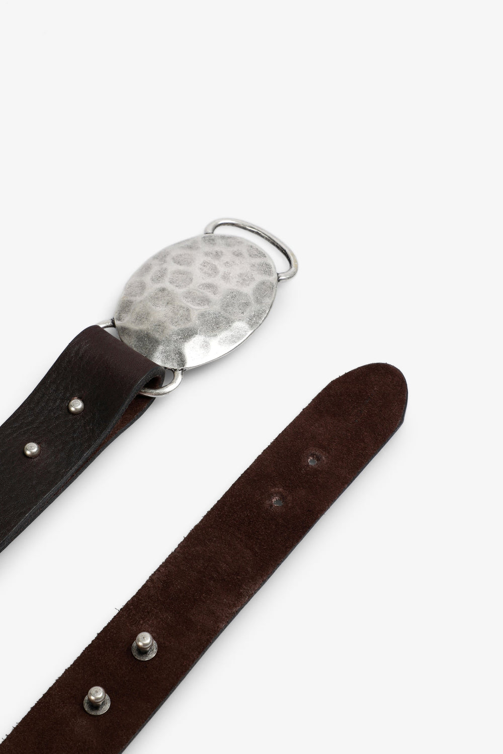 Belt made of 100% leather with an oval metal buckle with an irregular texture.