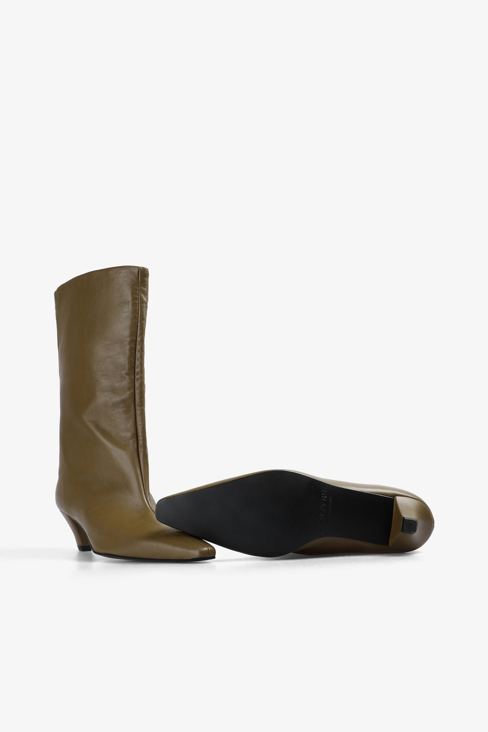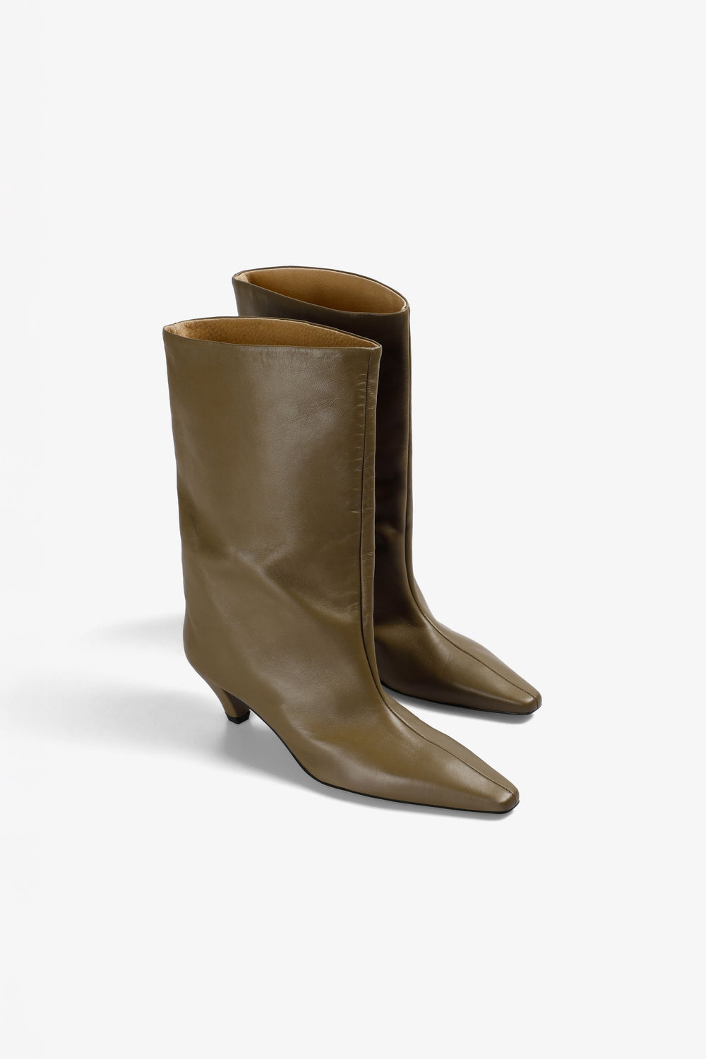 Boots made of 100% leather. Gathered leg detail. Medium Kitten heel. Pointed finish.