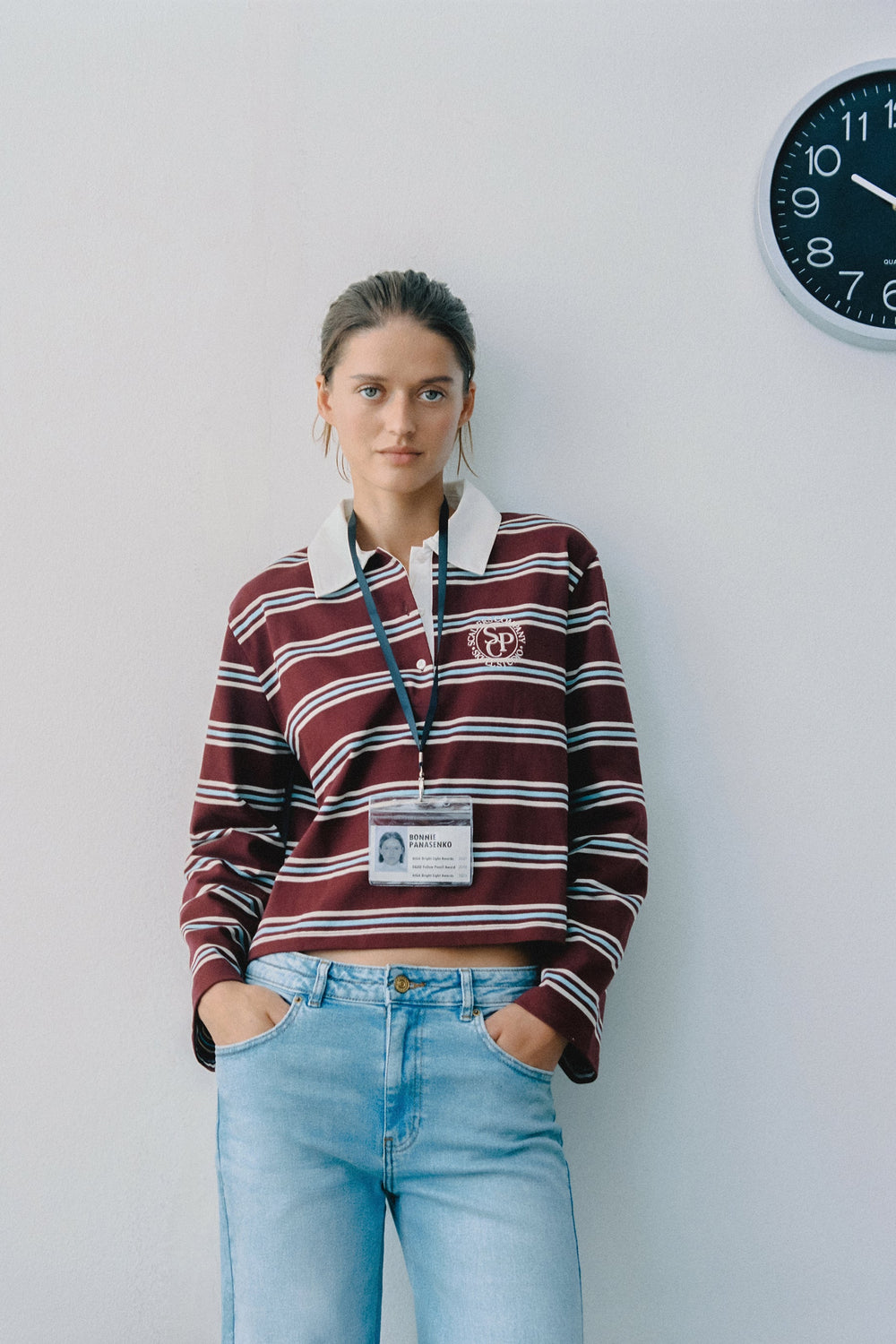 Polo shirt in 100% BCI cotton. Stripe print. Long sleeves. Contrasting collar. Button fastening. Embroidered contrast logo on the chest.
