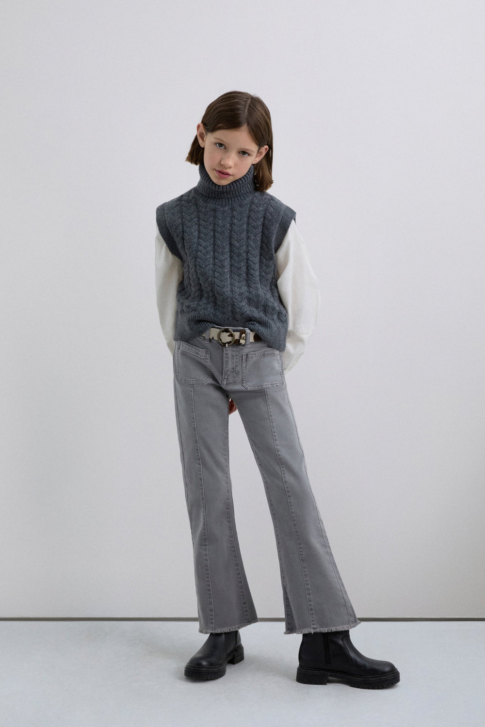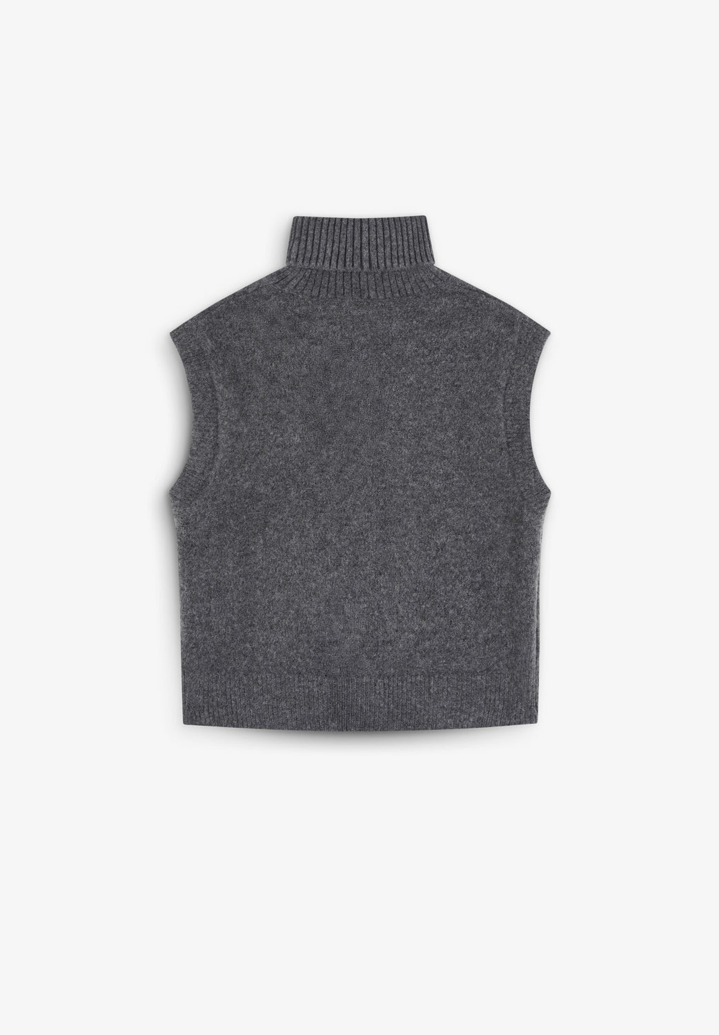 Chaleco de punto. Cuello vuelto. Acabados en rib. Detalle de calavera en chapa metálica.