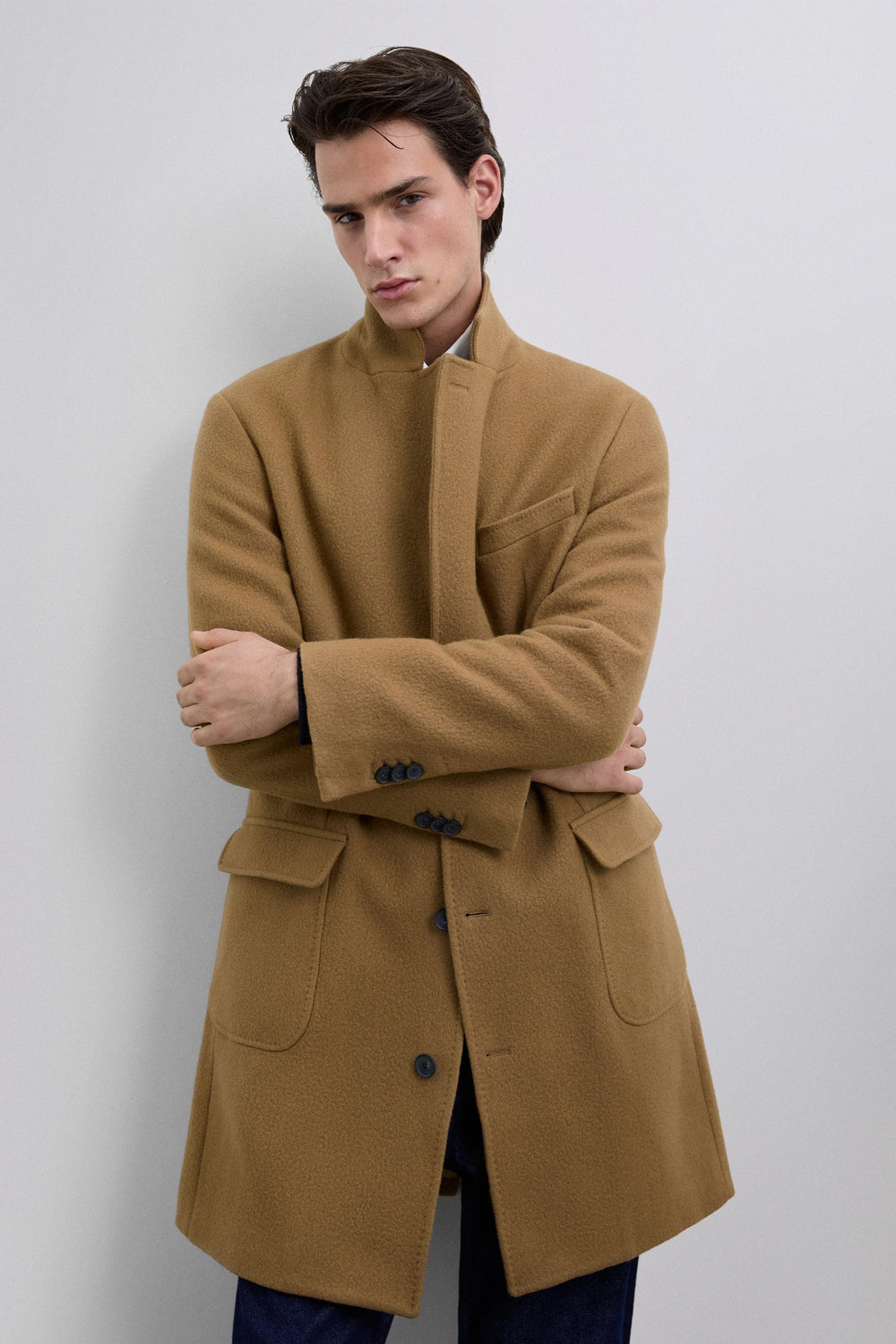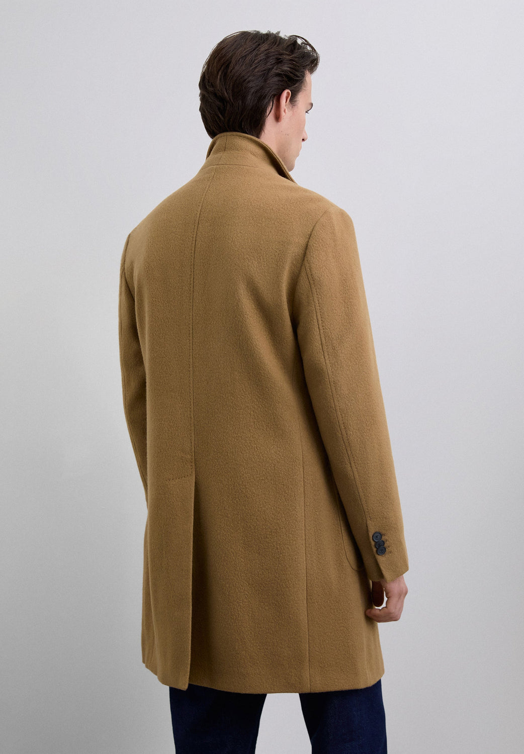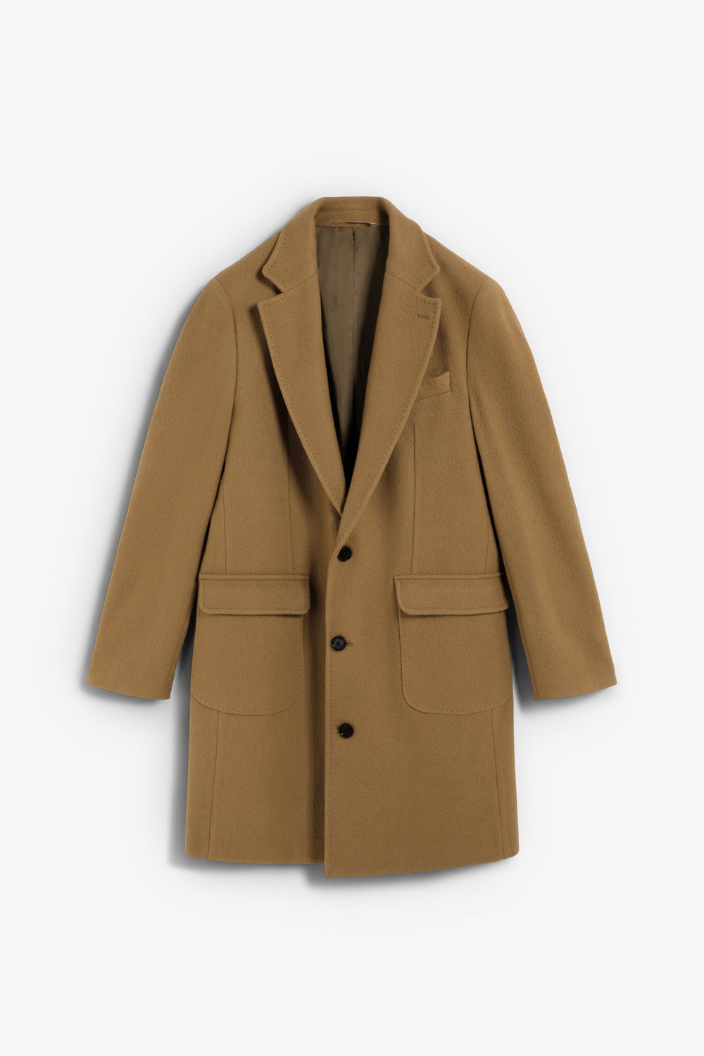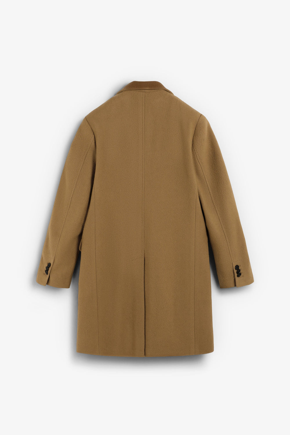 Long coat made of a high quality virgin wool blend. Lapel collar. Long sleeves with buttoned cuffs. Front pockets with double flap. Front button fastening. Back vent.