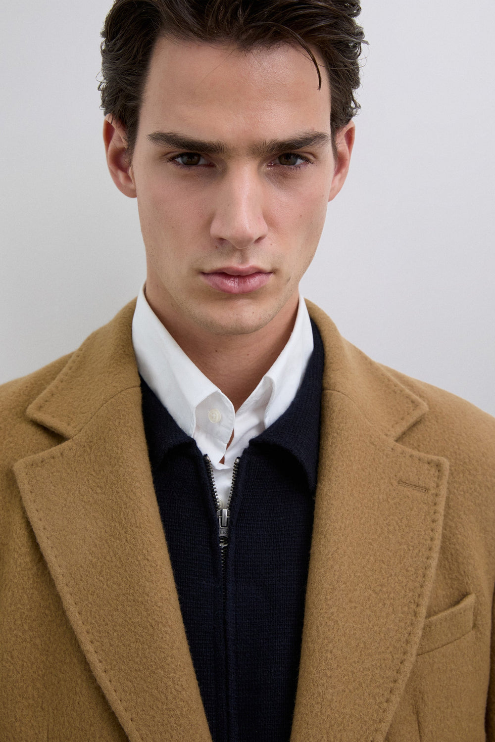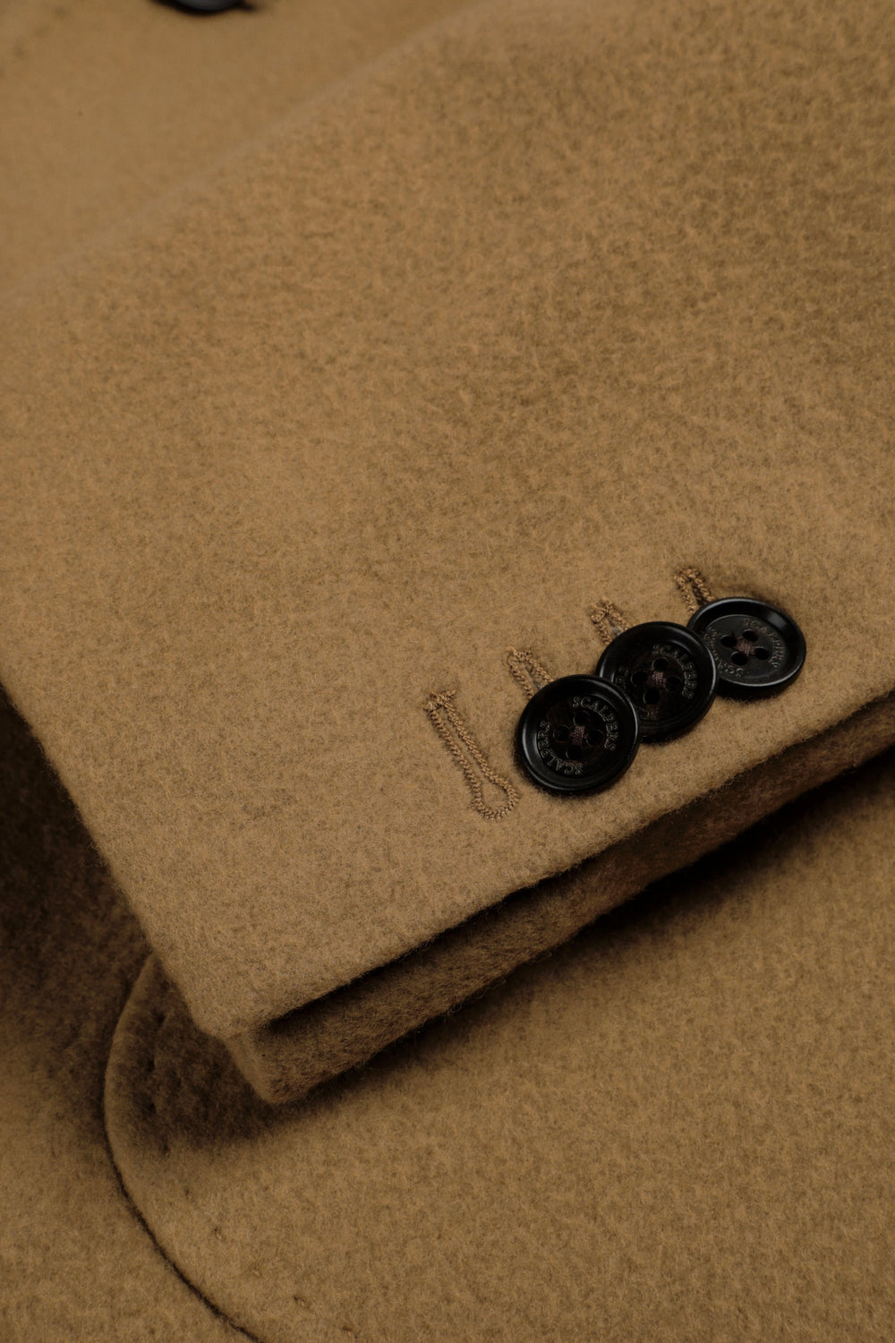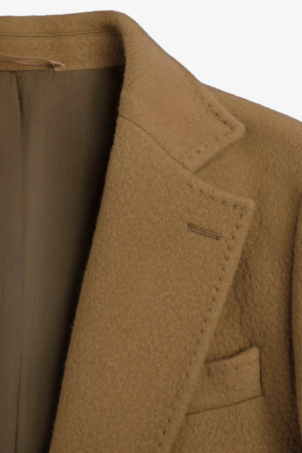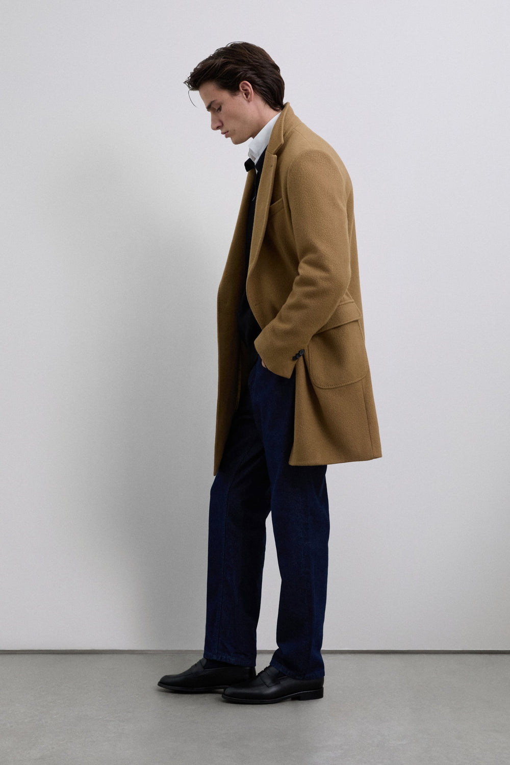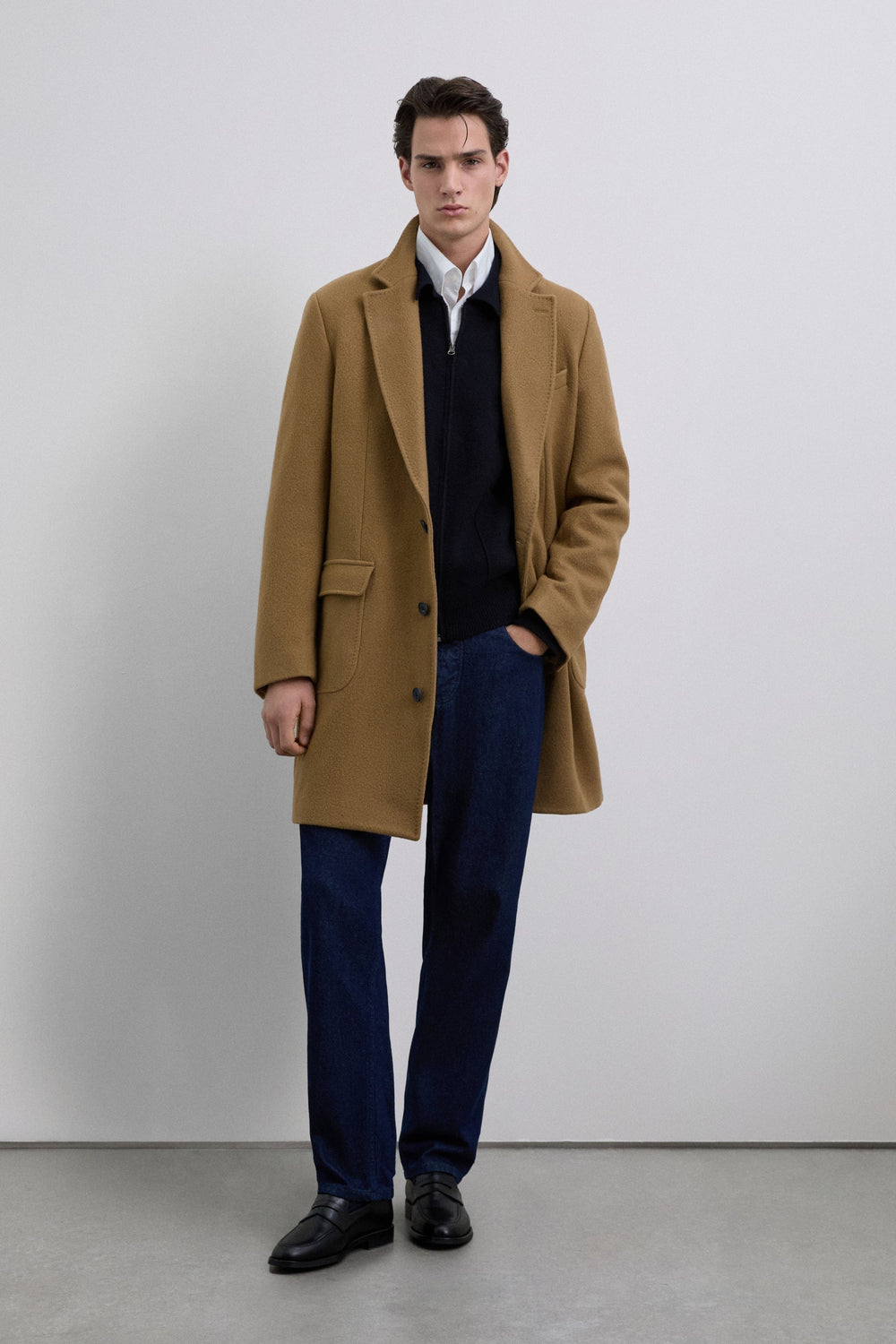 Long coat made of a high quality virgin wool blend. Lapel collar. Long sleeves with buttoned cuffs. Front pockets with double flap. Front button fastening. Back vent.