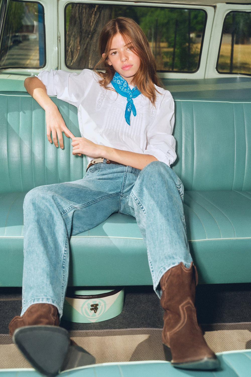 Wide led trousers made of 100% organic cotton. Button and zip fastening. Belt loops at the waist. Two front pockets and back pockets. Embroidered star detailing on the sides.