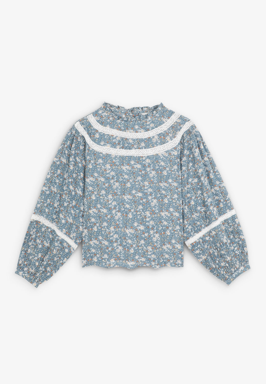 Blouse. Regular fit. Round neck. Long puffed sleeves with button fastening. Embroidered details on collar and sleeves. Back button fastening. Floral print. Ruffles on the hem.