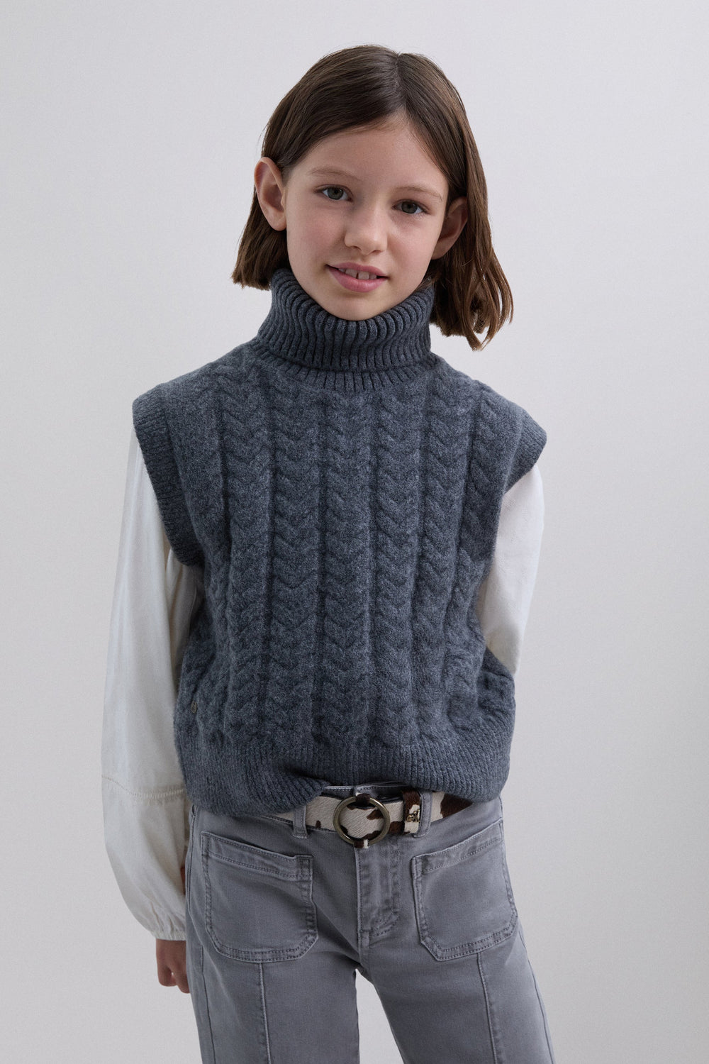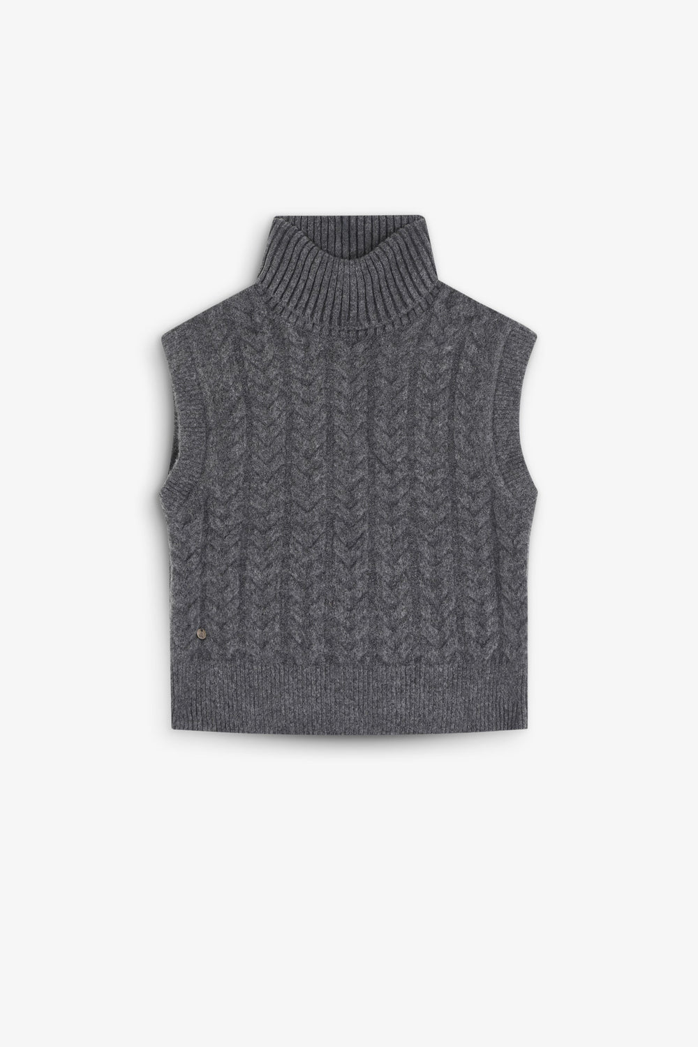 Knit vest. Roll neck. Ribbed trim. Metal skull tag detail.