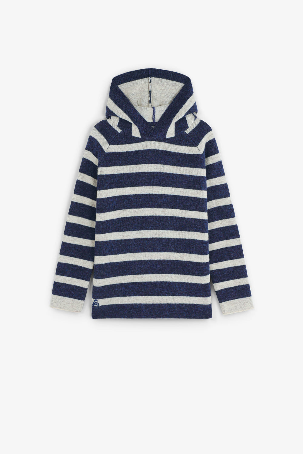 Hooded knit sweater made of a wool blend. Stripe print. Long sleeves. Contrast embroidered skull on the hem.