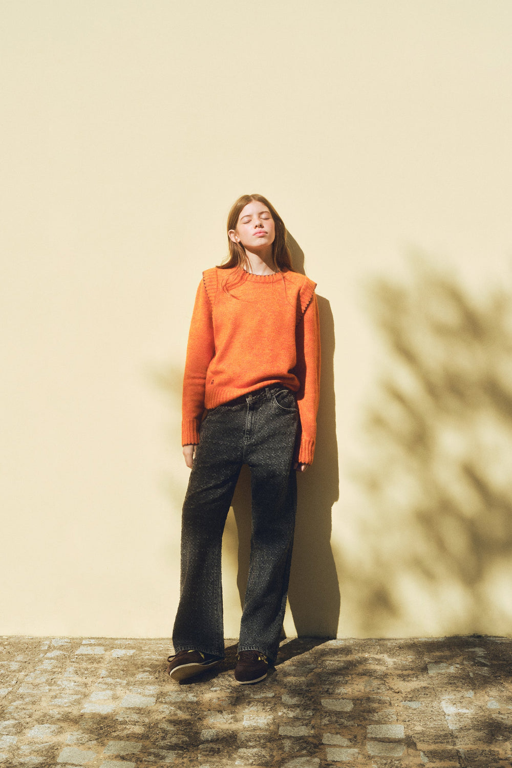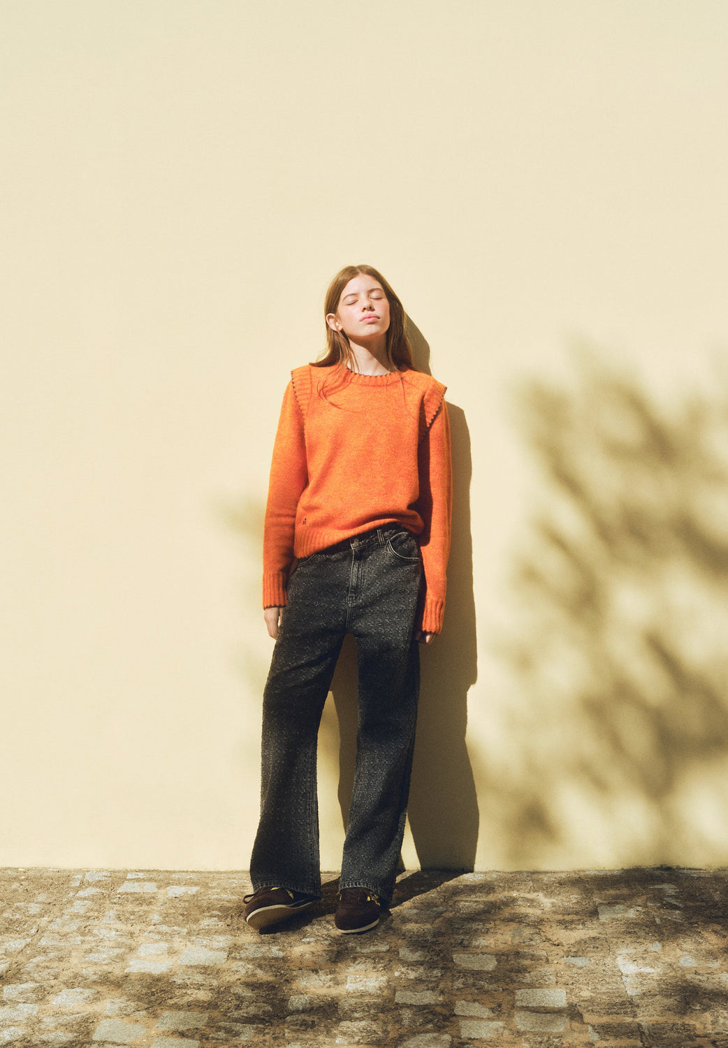 Jeans made of slightly stretchy cotton with laser-printed metallic thread. Flared cut, zip and button fastening and belt loops. Side and back pockets.