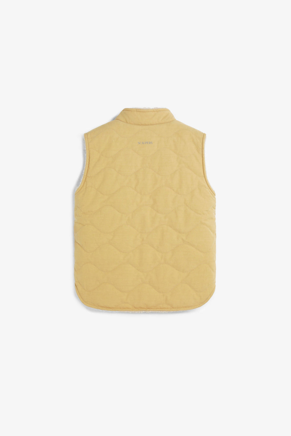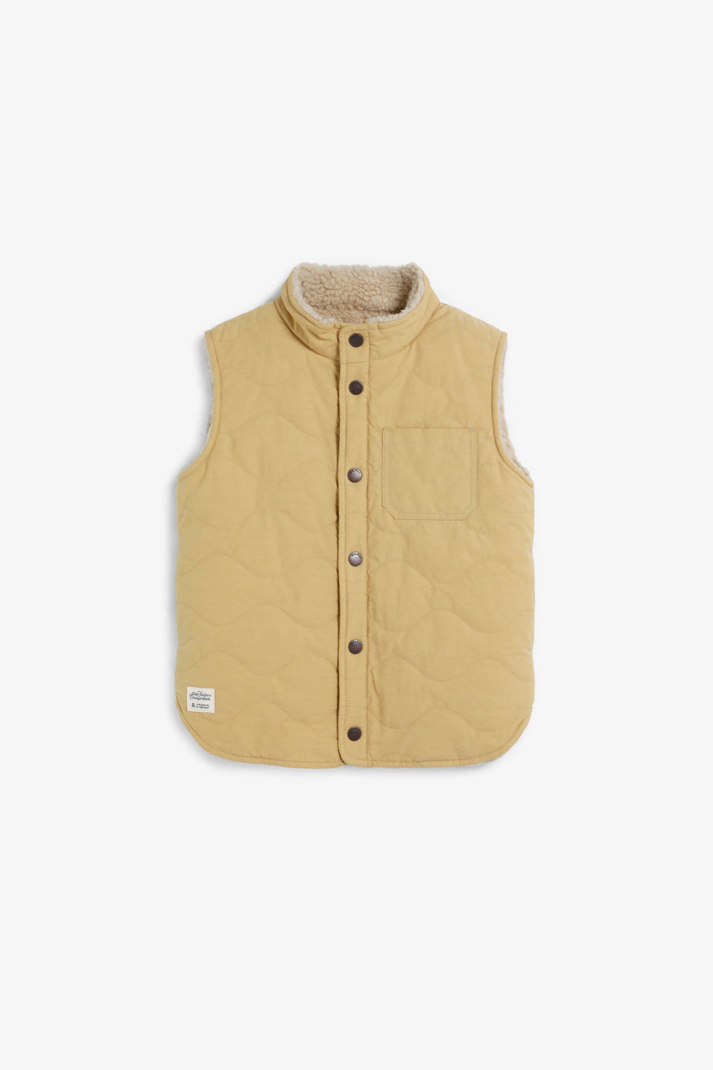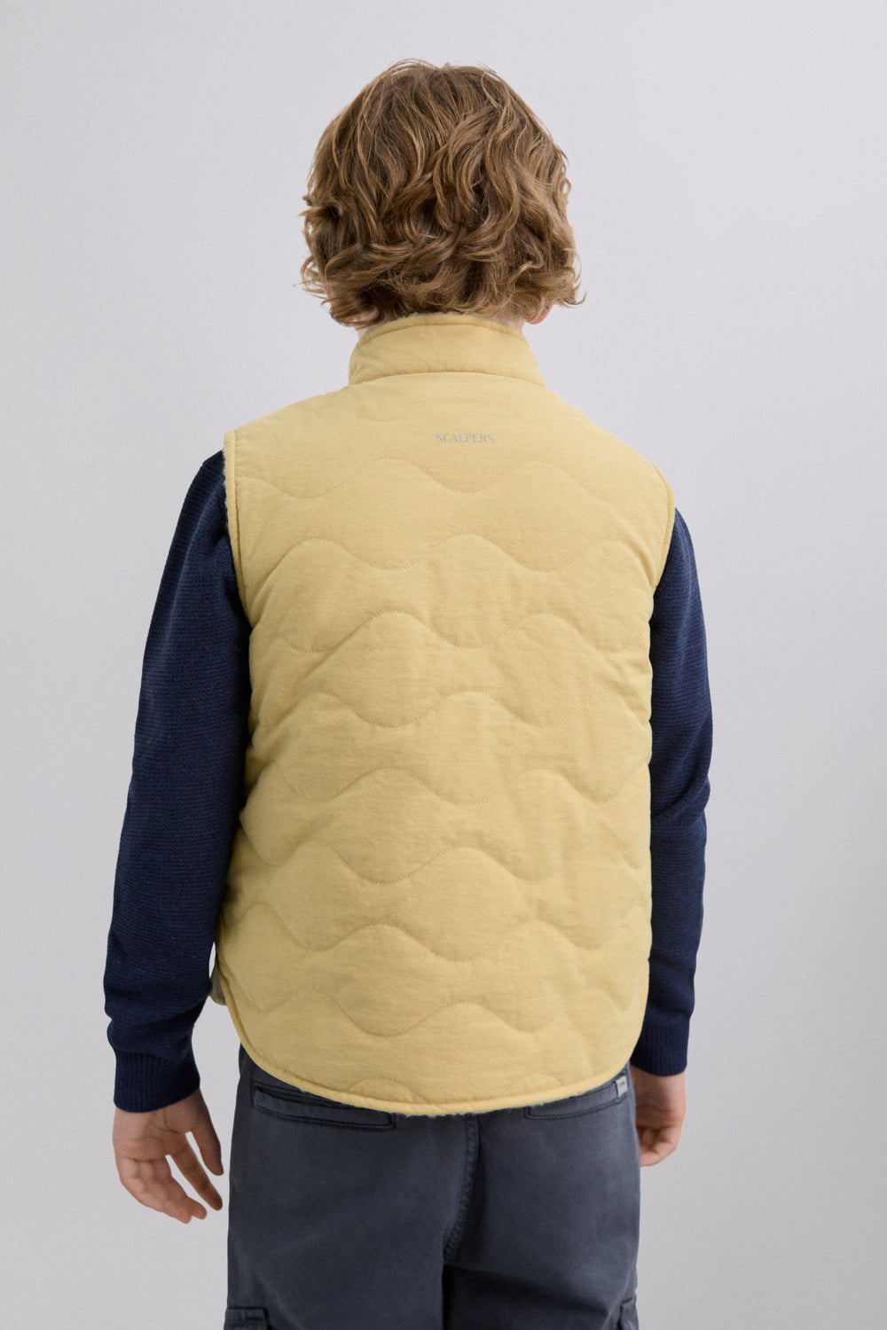 Puffer gilet made of cotton and nylon blend with outer pocket. Shearling lining made from recycled material. High collar. Regular fit. Button fastening.