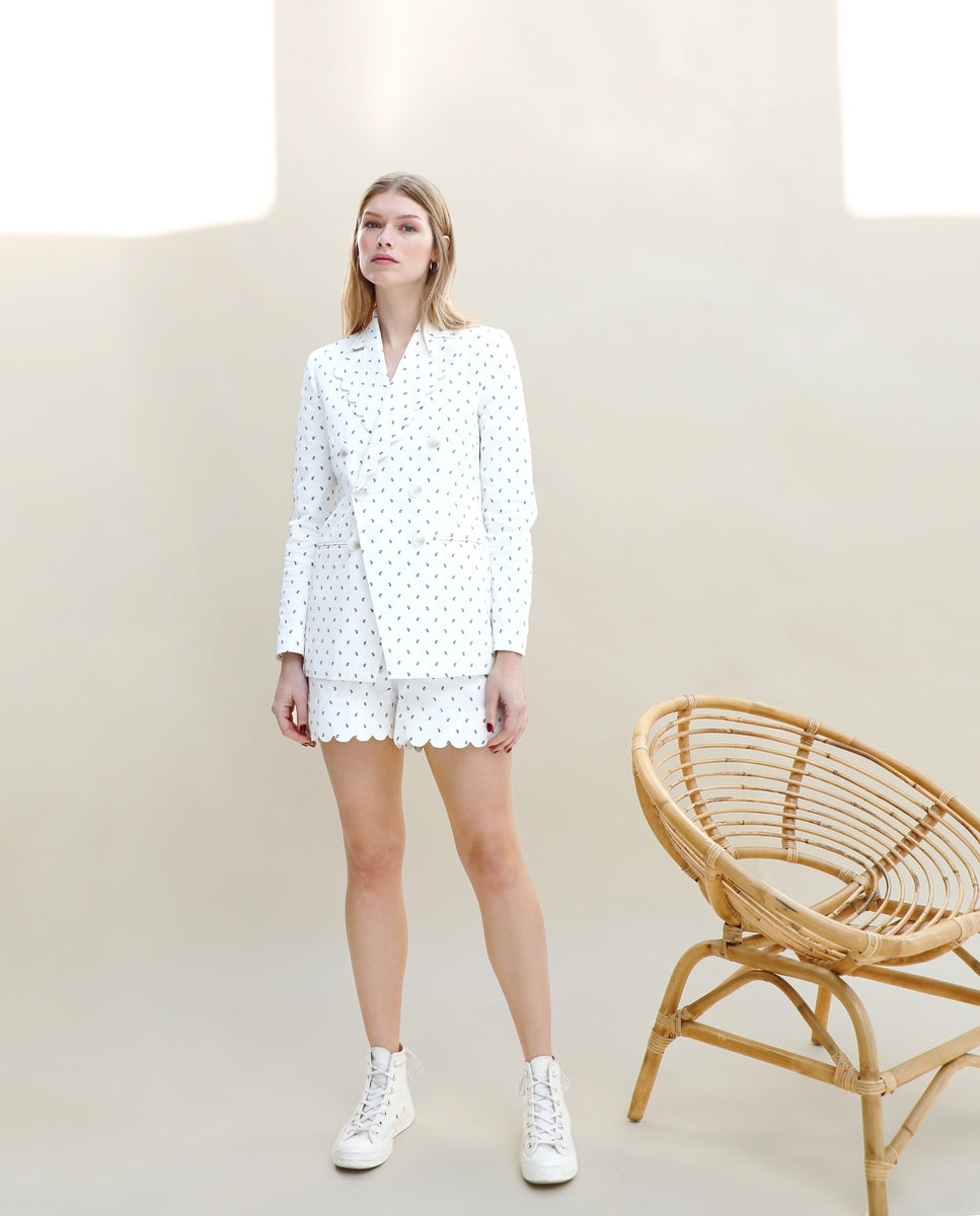 Americana con estampado pasley confeccionada en algodón. Corte slim fit, cuello con solapas de muesca con terminación en ondas y cierre con botonadura cruzada. Manga larga y bolsillos insertados.